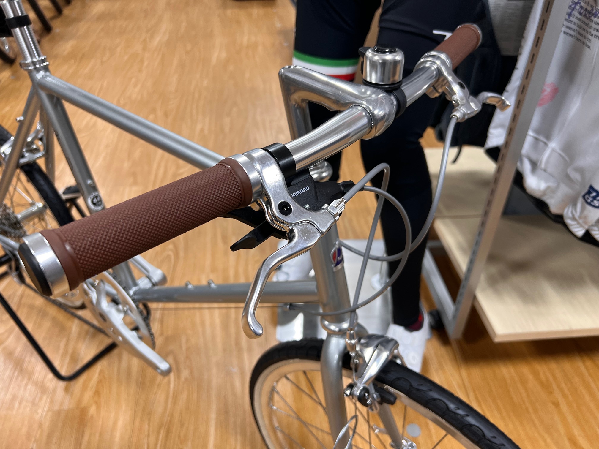 フラットハンドルにブラウンのグリップ、シルバーのブレーキレバー!