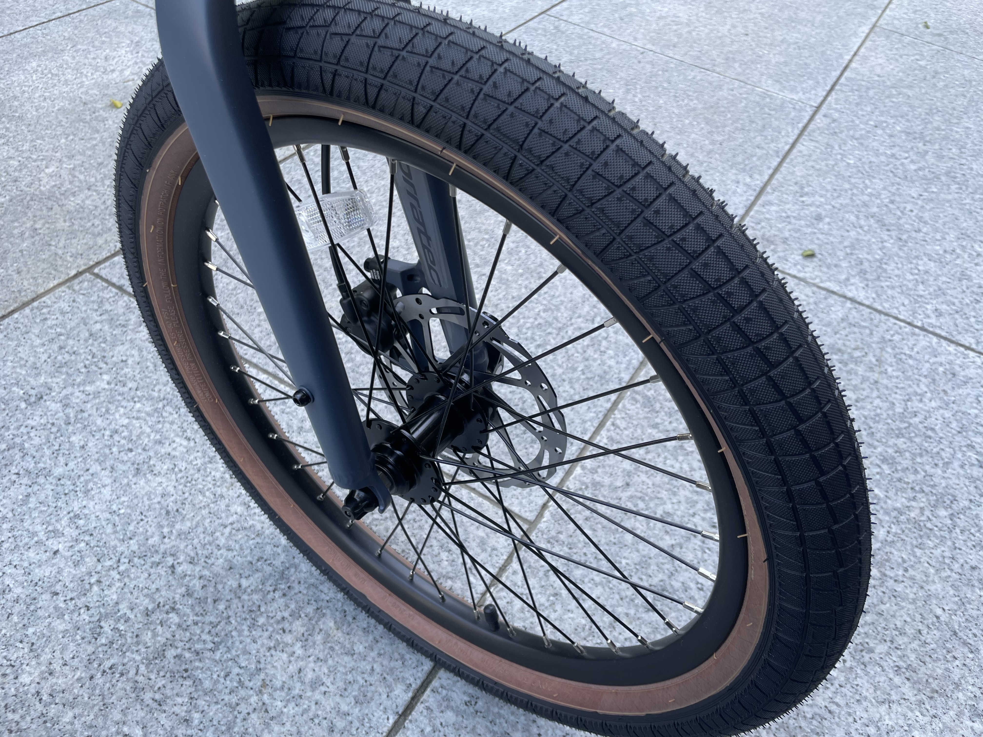 一番のポイントは、ミニベロの常識を覆す2.3インチの超極太タイヤです。