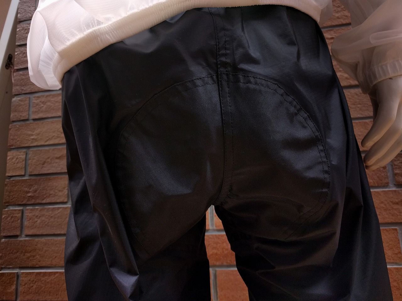 お尻の部分は他のブランドのレインコートに比べると長くなっており跳ね上げによる衣服の汚れをカバーします