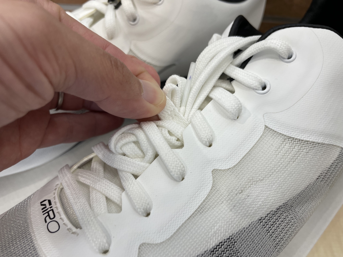 ちなみに、同色で分かりにくいですが、余った紐を束ねるゴムがちゃんとタンについてますので、ペダリング中にチェーンなどに絡まったりする心配はございません。