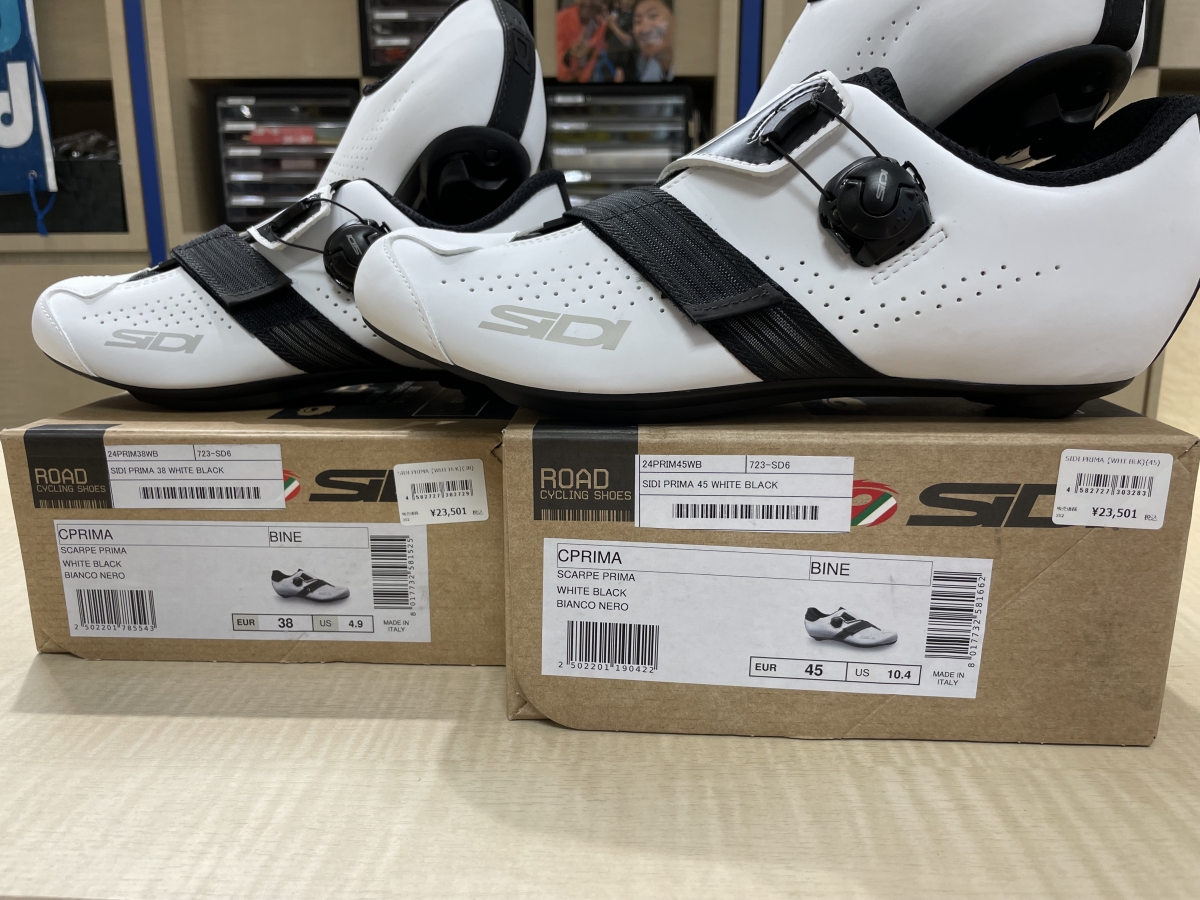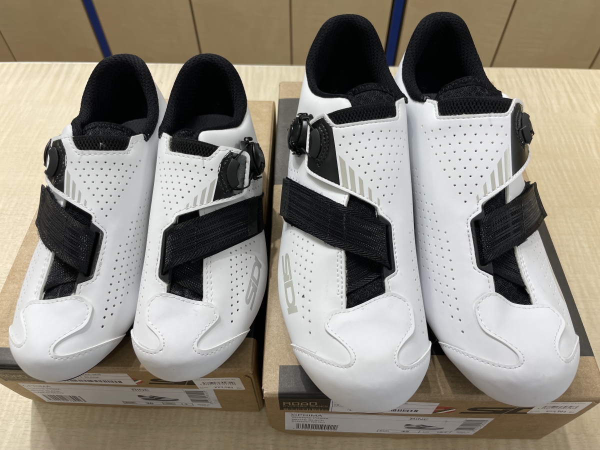 通常サイズでは、ホワイト・ブラック・ブラック/レッドの3カラーを在庫しておりますが、今回フィールサイクルを含め、女性サイクリスト需要の高まりから、ホワイトカラーで38サイズ(23.3cm)も追加してみました!