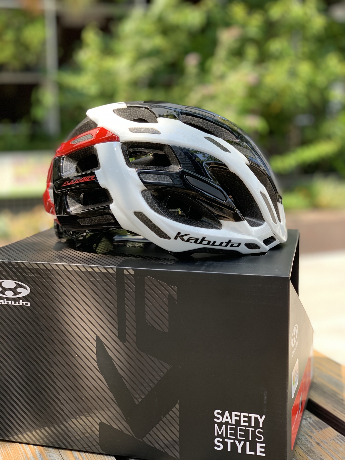 ヒルクライムにおすすめです。S/Mサイズで重量驚異の195g。圧倒的な軽量性と通気性を兼ね揃えたヘルメットKABUTO FLEX AIR ¥29,700(税込)。