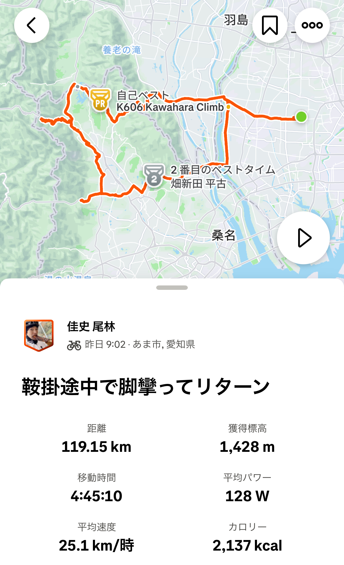 その後も回復しなさそうだったので、折り返してランチ休憩をし、十分に水分補給をしてから宇賀渓で水浴びを楽しんでから帰宅し、距離こそ120kmに達してますが、平均パワーが見るも無残な数値になってしまいました・・・