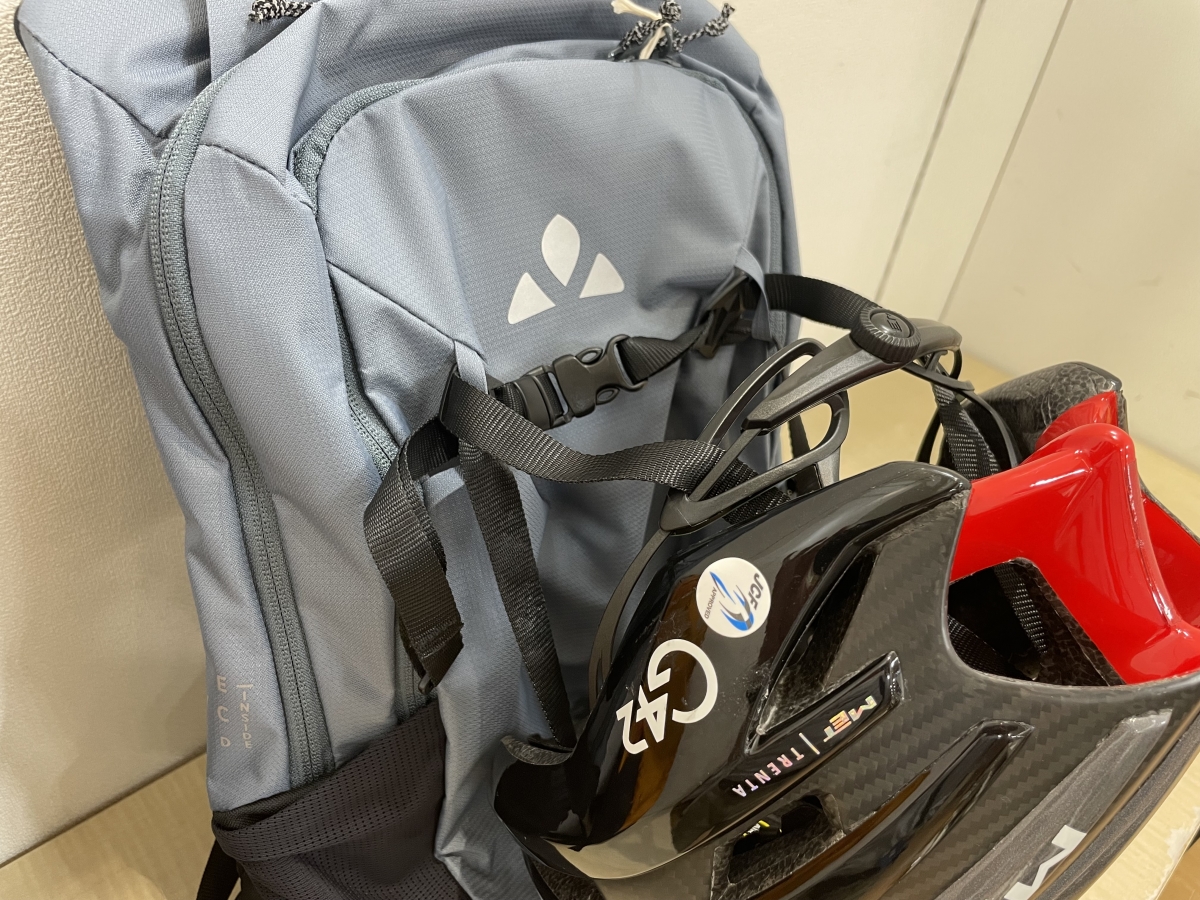 持ち運びに困るヘルメットは、ヘルメットホルダーにあご紐を通しておくことで、収納容量を邪魔せずに持ち運ぶことが出来ます!