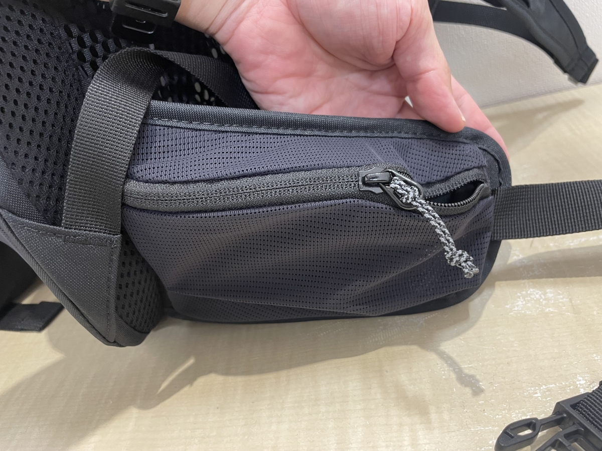 右側のヒップベルトには、背負ったままでも小物が取り出しやすいジッパーポケットも用意されていますので、ここにクレジットカードなどを入れておくと、通勤中にコンビニなどに立ち寄った時のお会計もスムーズに出来ます。
