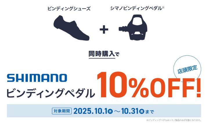 ちなみに、今月中ならシューズと一緒にSHIMANOのペダルを同時にご購入していただけると、ペダルも10%OFFとなるキャンペーン中ですので、ビンディングデビューやペダルのグレードアップを考えている方は、今がチャンスですよ♪