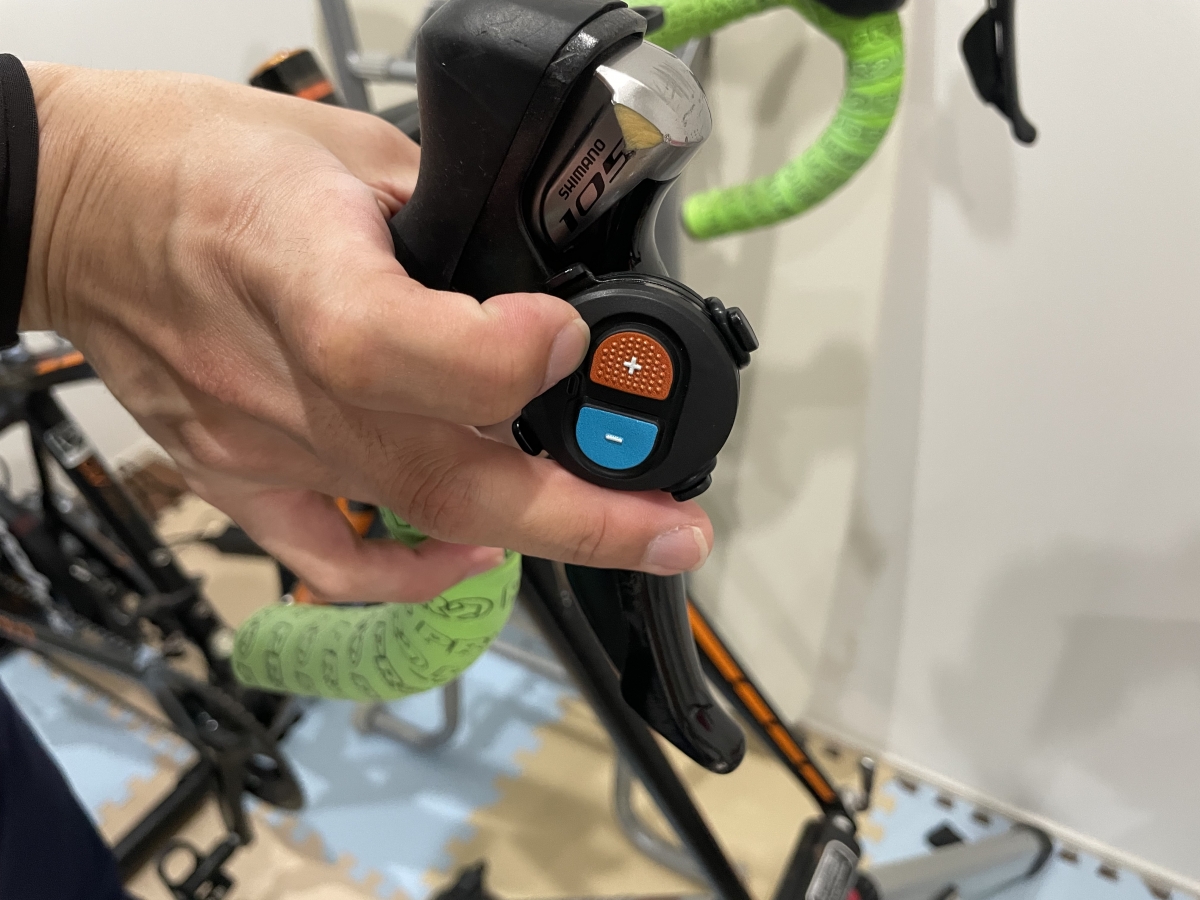 ちなみに、Zwiftクリックはゴムバンドで固定するので、多少無理やりでしたがシフトレバーの位置に合わせて取り付けたら、Di2っぽい操作感になって気に入っています(笑)