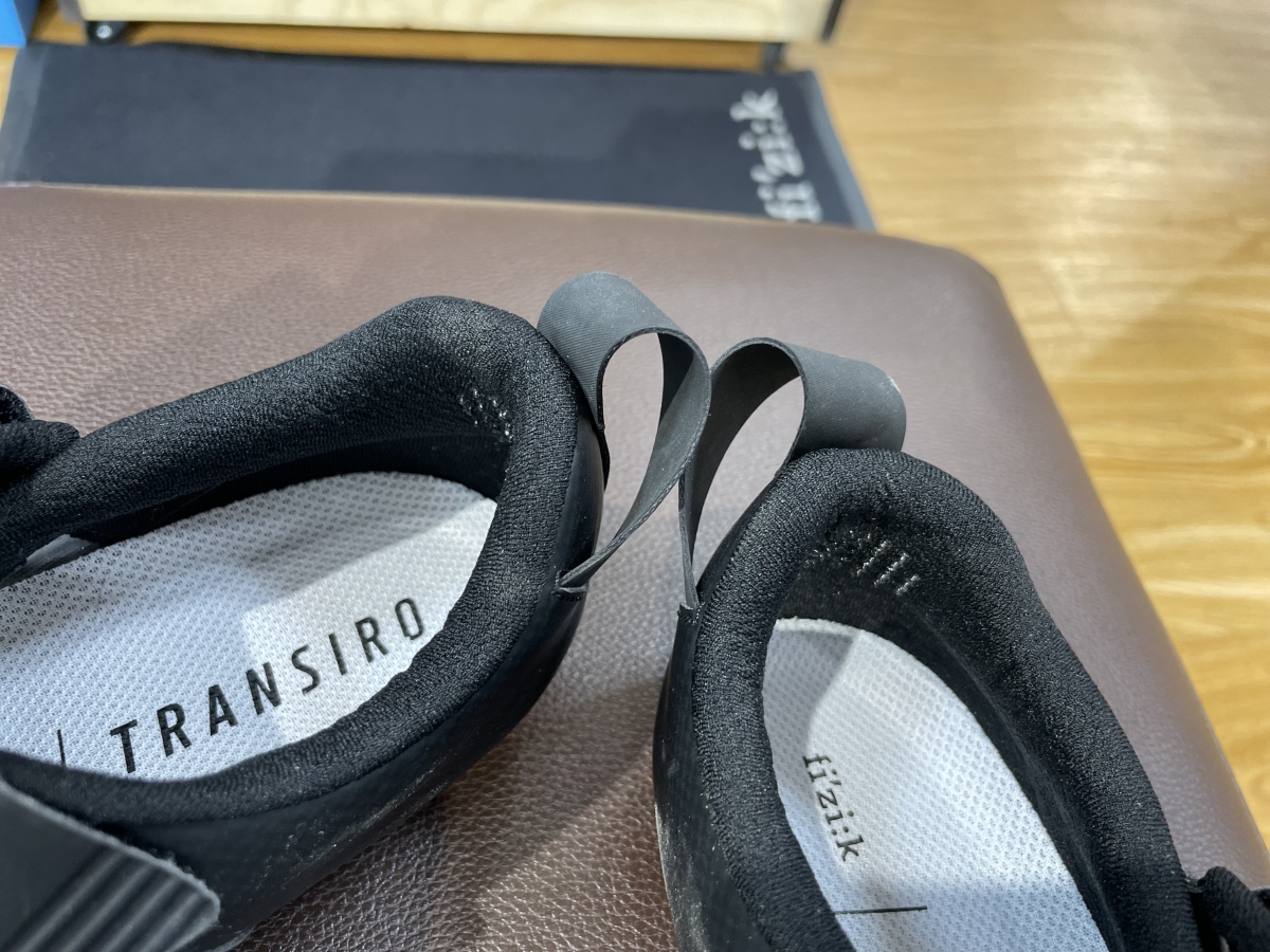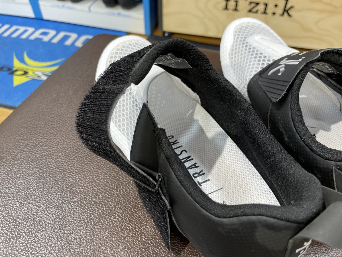 素早く脱ぎ履きが出来るように、大きく開くベルクロストラップとヒールの指掛けループがトライアスロンモデルならではで、ベルクロの開き方が通常と逆になっているのは、開いたままでペダルに取り付けたまま、自転車に飛び乗って走りながらシューズを履く際に、ストラップがチェーンなどに干渉しない様にするためです。