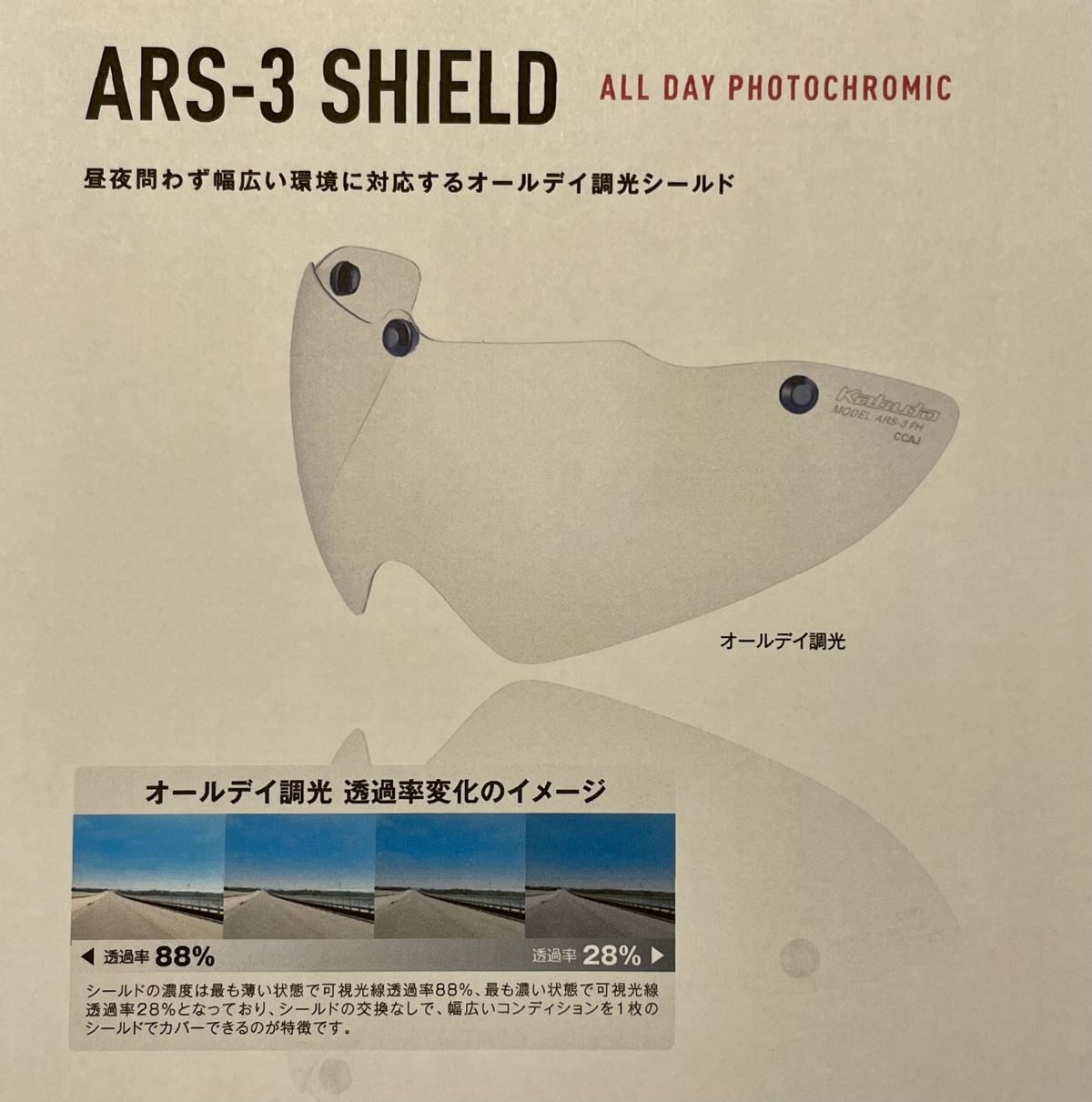KABUTOヘルメットの一部のシールド対応モデルに取り付けられる、交換用シールドであるARS-3に調光モデルが復活いたしました!!