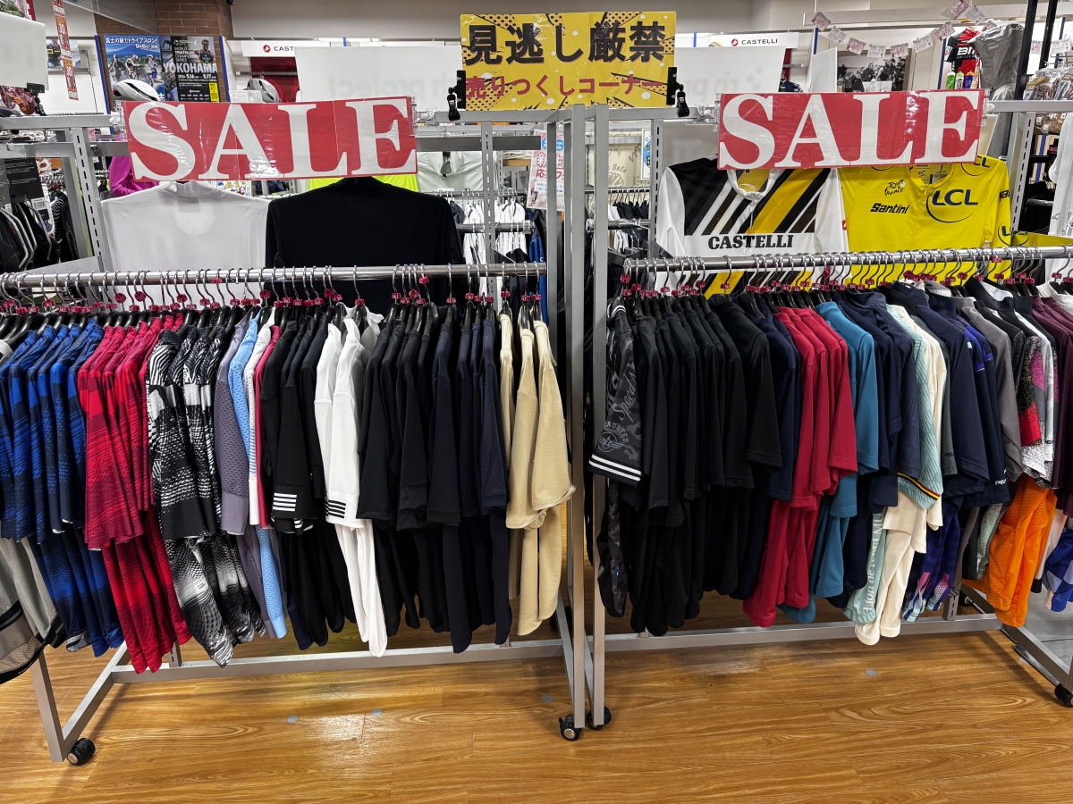 こんな感じで、探せば掘り出し物が見つかるかもしれないSALEコーナーを分かりやすくしておりますので、お買い得なサイクルウェアをお探しの方は是非!ワイズロード名古屋ウェア館へご来店下さいませ!お待ちしております♪
