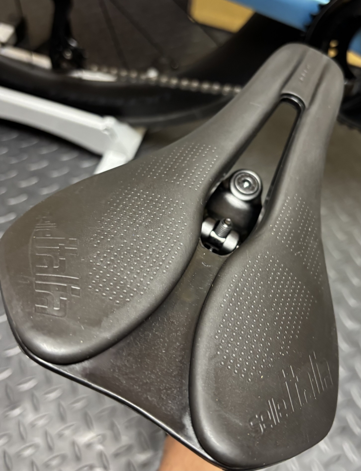 デフォルトでSelle italiaのサドルがついています。ただ、このサドル、先端が薄くて硬いうえに、サイクルラックにひっかけにくいという致命的な欠陥を抱えています。なので、早急にここをカスタムしようと思っています。