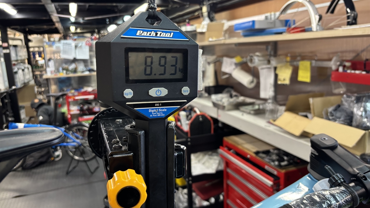 気になる重量は、ボトルケージ込みで8.93㎏。V4は軽量に振っているわけではないので、持って「軽っ!!」と感じる重量ではないです。でも、あとで書きますが、その重量に見あう、ものすごい剛性を感じました。