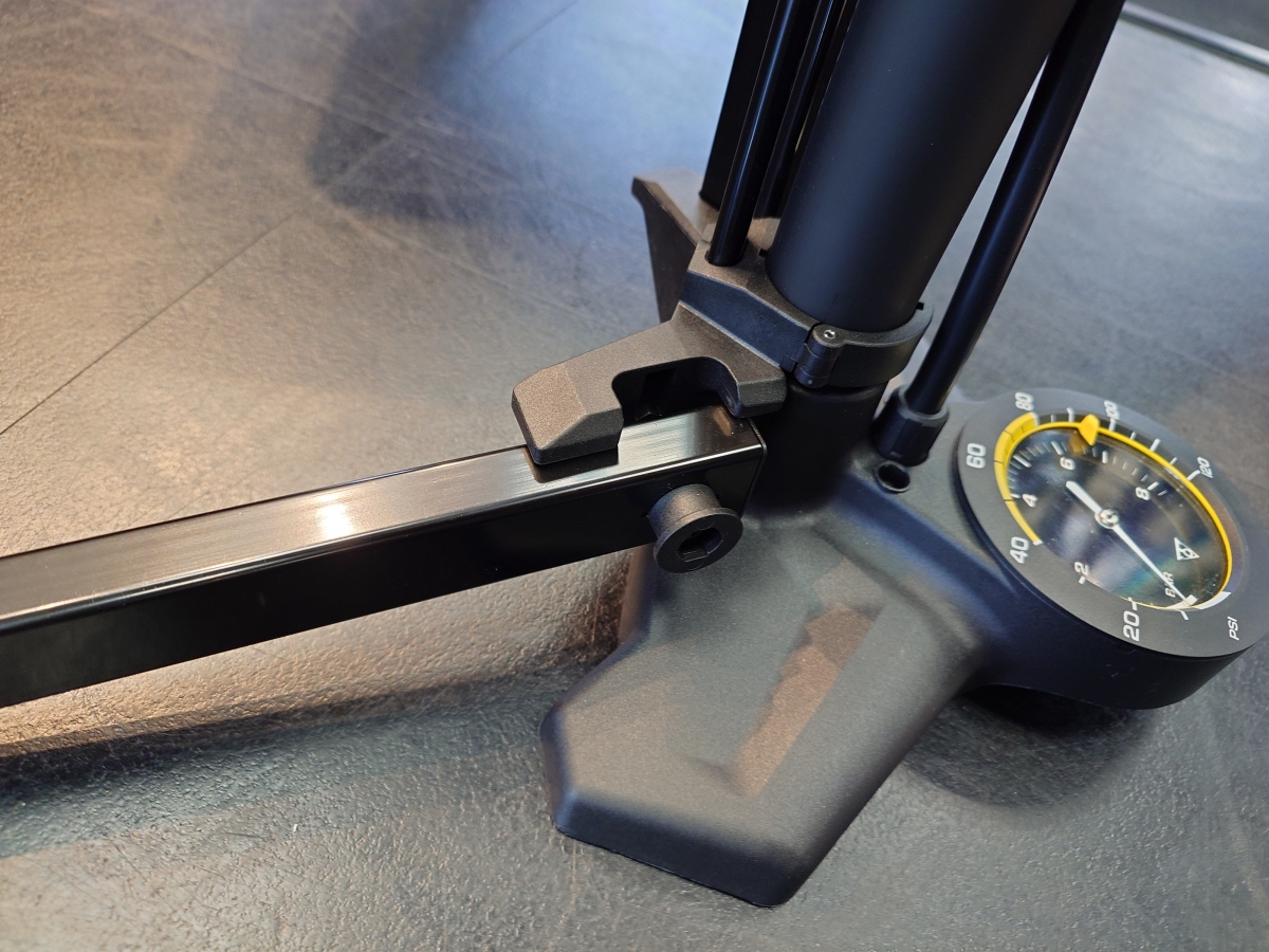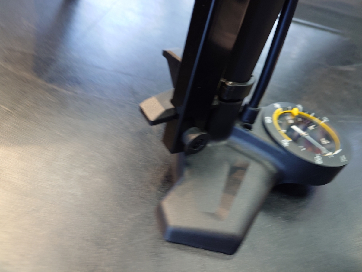 スタンドが付いた状態でポンプを持ってきて、好みの空気圧に設定して、ポンプを片付けて、そしてスタンドから外して。