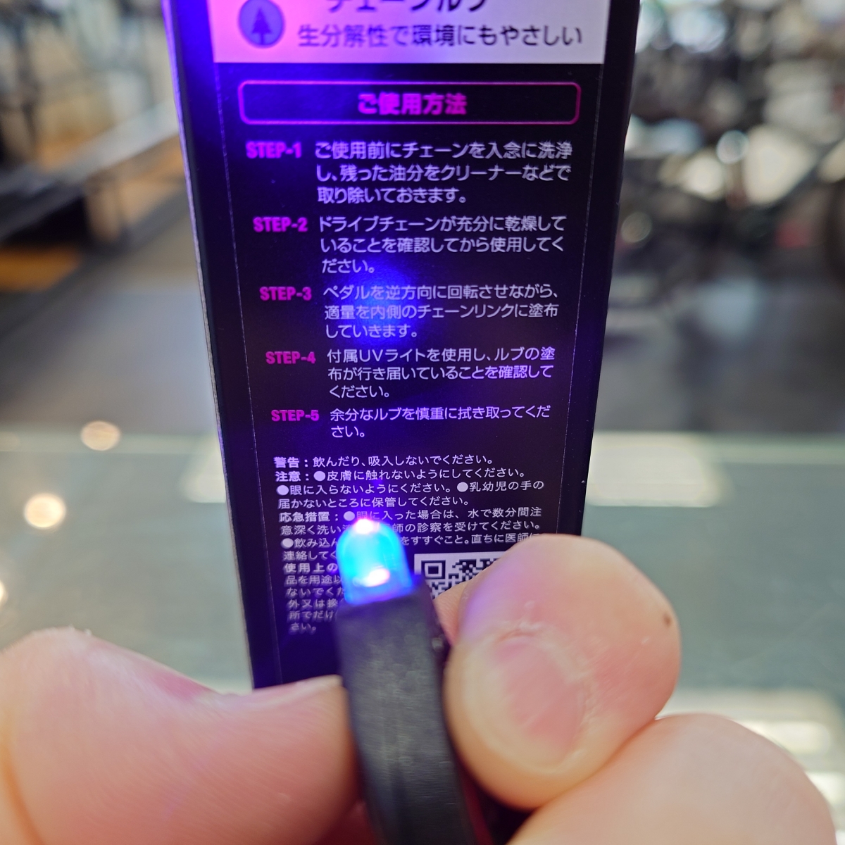 何度か触れてきていますが、マックオフのチェーンルブにはUVライトが付属してきます。そして、ルブはそのUVライトに反応して光る性質を持っているので、ルブが満遍なく塗布されているか、ライティングで確認できます。
