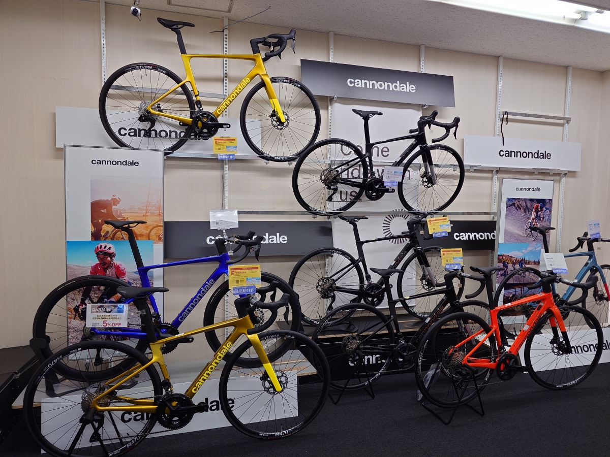 キャノンデールコーナーでは、入門機以外にもフルカーボンのモデルや、グラベルロードなども展示販売中。