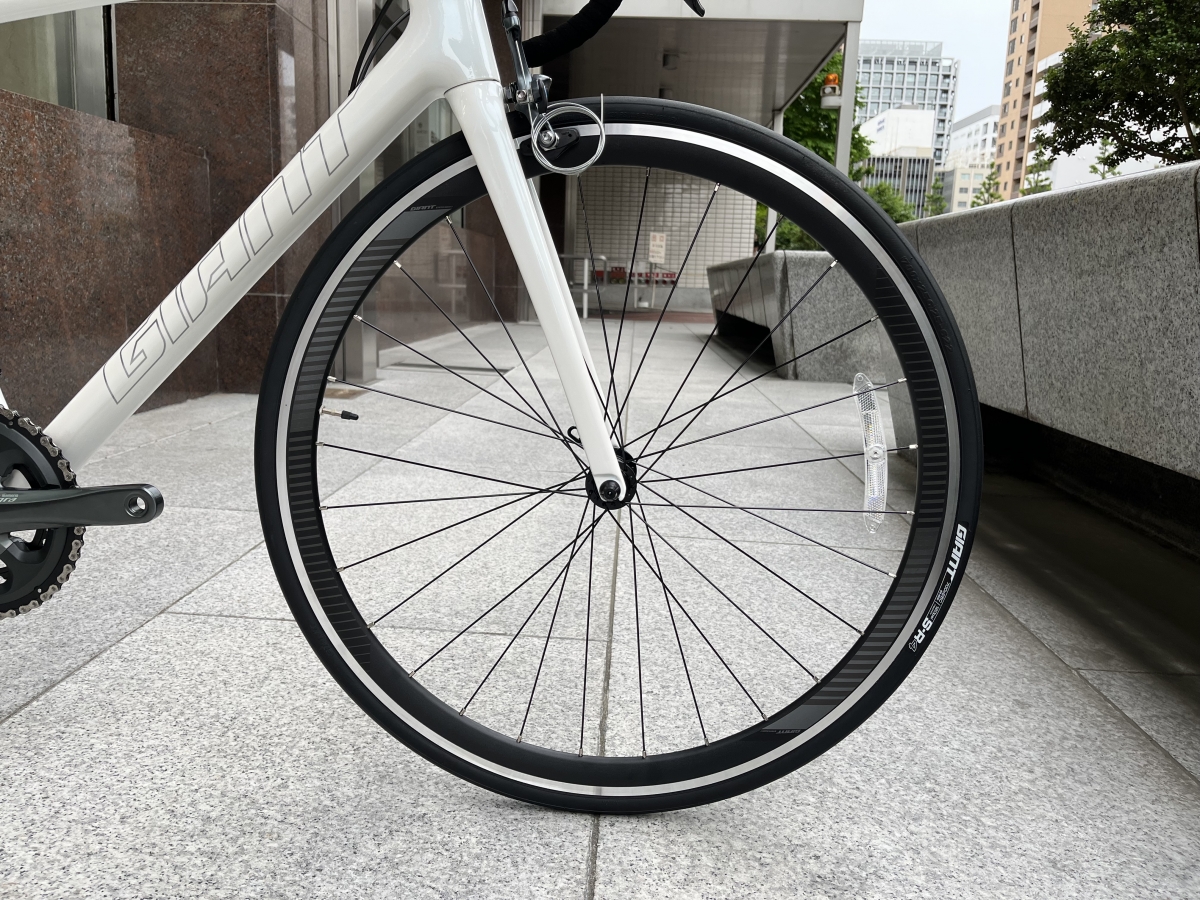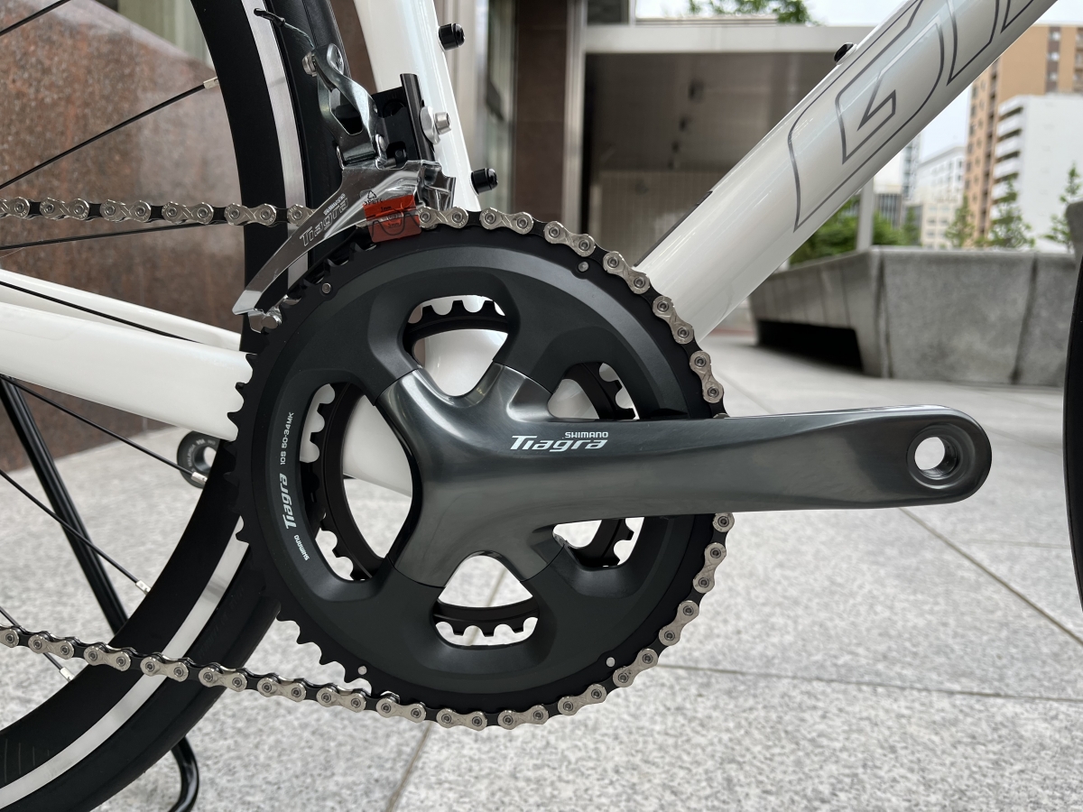 フルカーボンでセミエアロなフレームとホイール、加えて駆動周りはTiagra10速でセッティング。