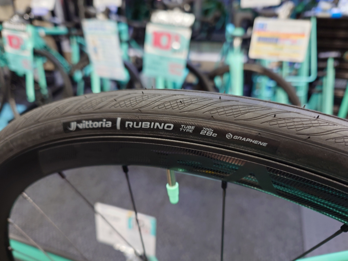 現在新規で入荷してきている、ビアンキのオルトレレースにはラベルカラーが特殊なモノがついてきています。リム幅が23mmですが、タイヤは実測29.8mmくらいでした。指定リム幅より4mm大きいので2mm程度膨らむという予定通りの広がり方。