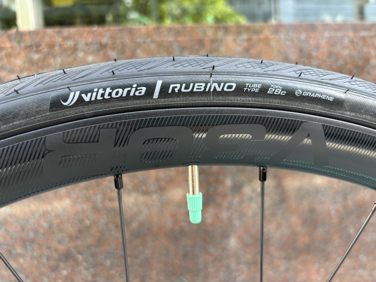 ホイールはFULCRUMのものからVELOMANNのホイールに変更されています。スペック的にはあまり差はないですが、リム内幅が23mmになったおかげで、タイヤは28Cですが実測30mmくらいまで広がっています。これで乗り心地に貢献です。また、タイヤは新モデルのRUBINOを搭載しています。
