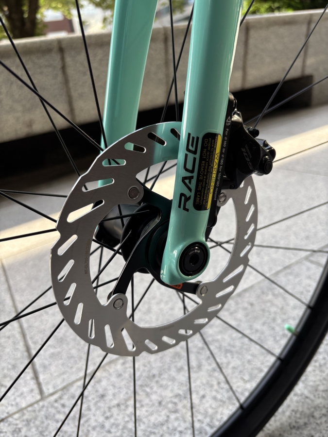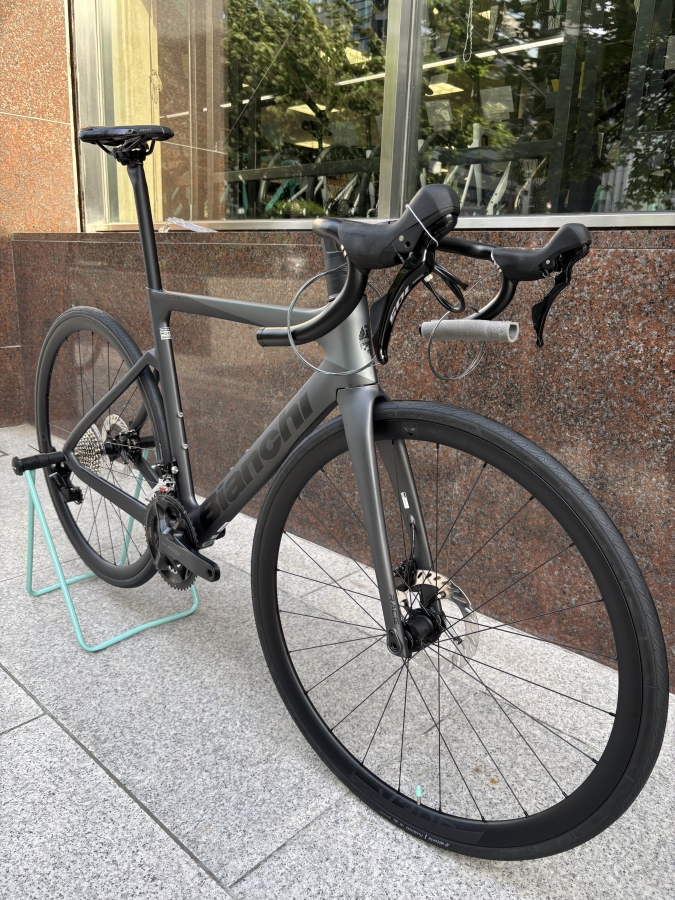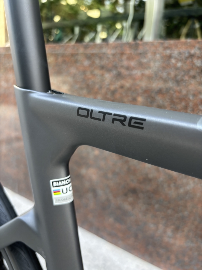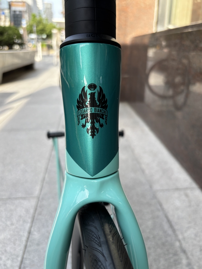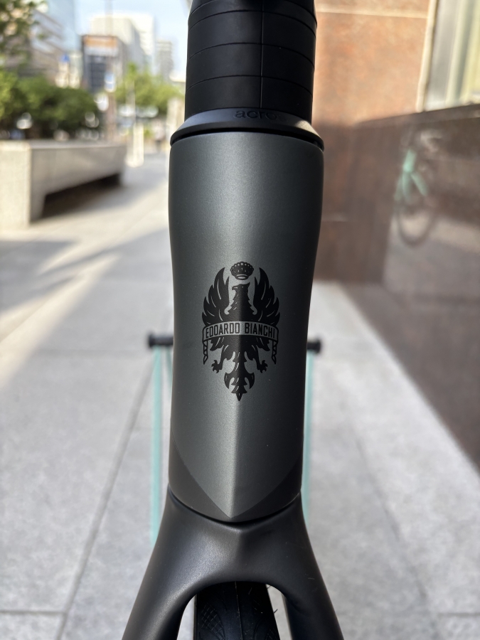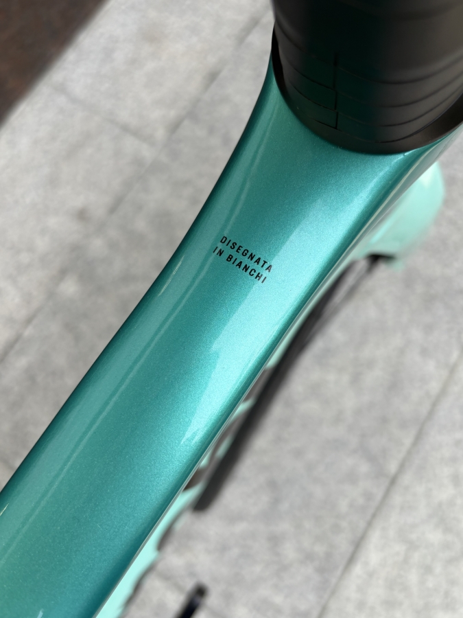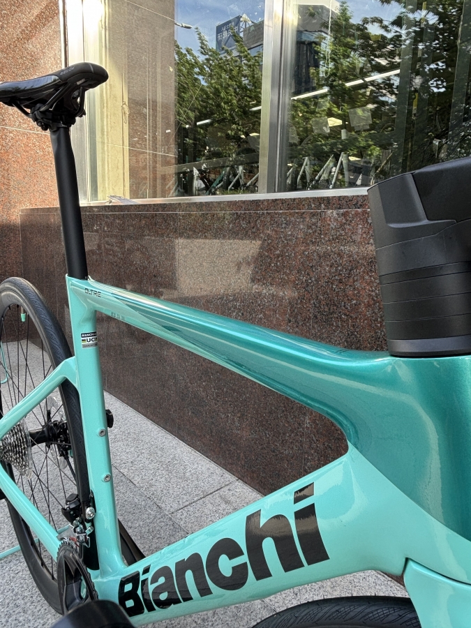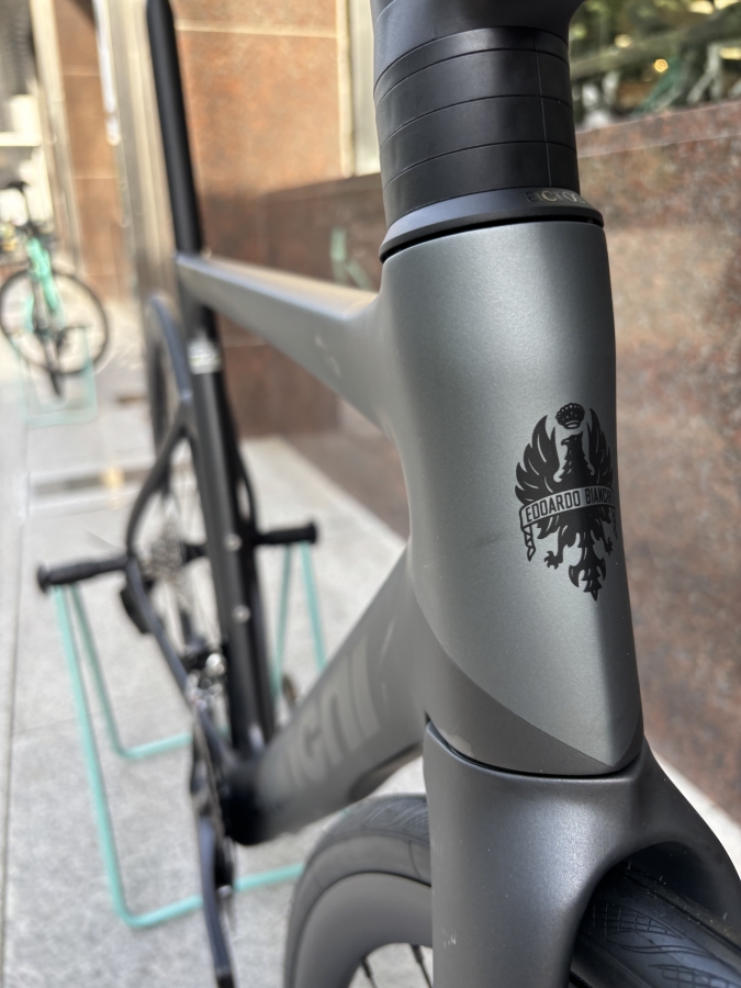 走りには関係ないですが、トップチューブのBianchiのマークがワッペンから塗装に。また、トップチューブの上のマークはなくなっています。僕的にはワッペンより塗装の方が好みですね・・・