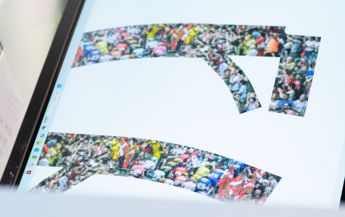 グループが群衆の中を駆け巡る選手の大群が下地にプリントされています。