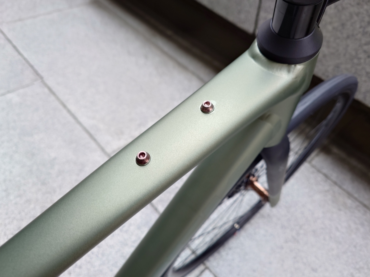 トップチューブやBB付近にケージマウントがあるため、ここにストレージを増設できる点もツーリングバイクとして満点の評価。