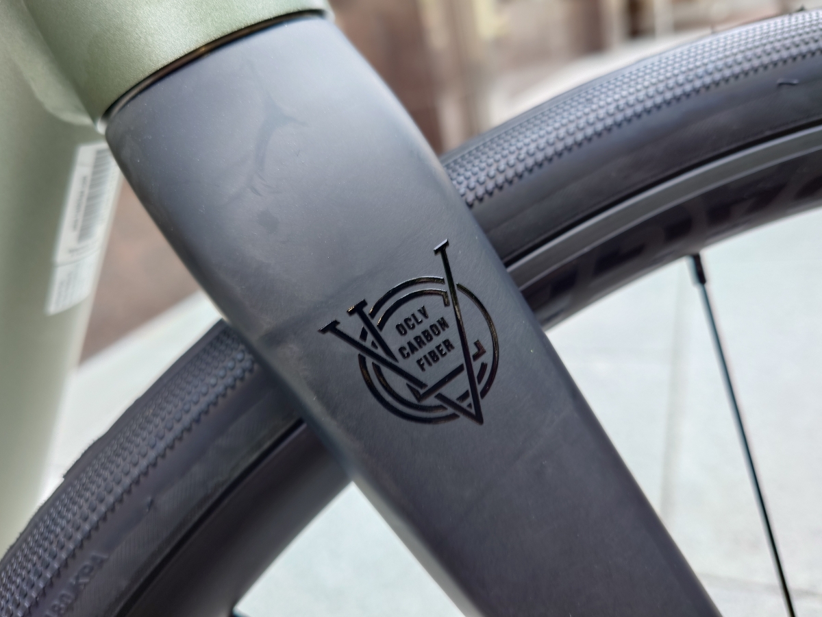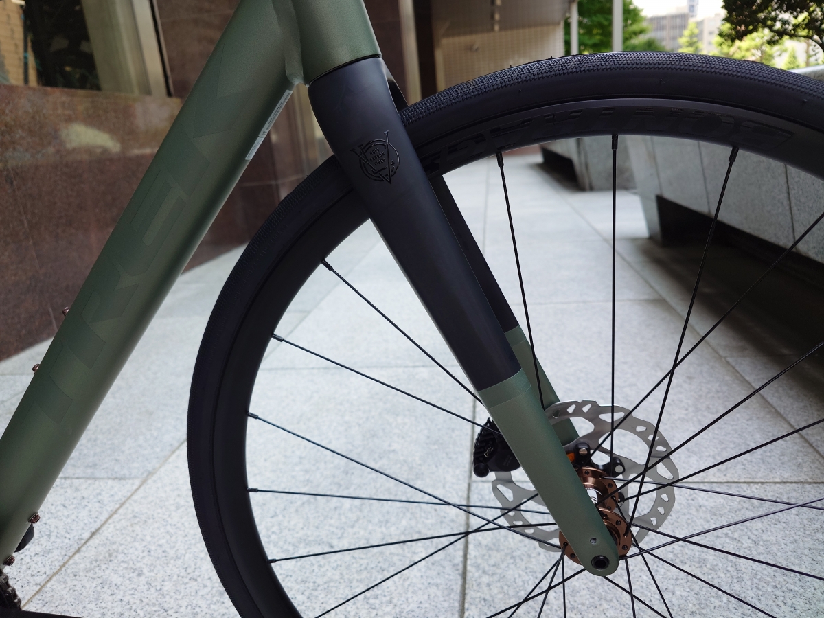 OCLVというトレックの特許製法、高圧縮低空隙のカーボンを使ったフォーク。カーボンらしさを味わってもらうために、一部塗装がクリアのみでカーボンの柄が見えるので、とても満足感のあるデザインです。