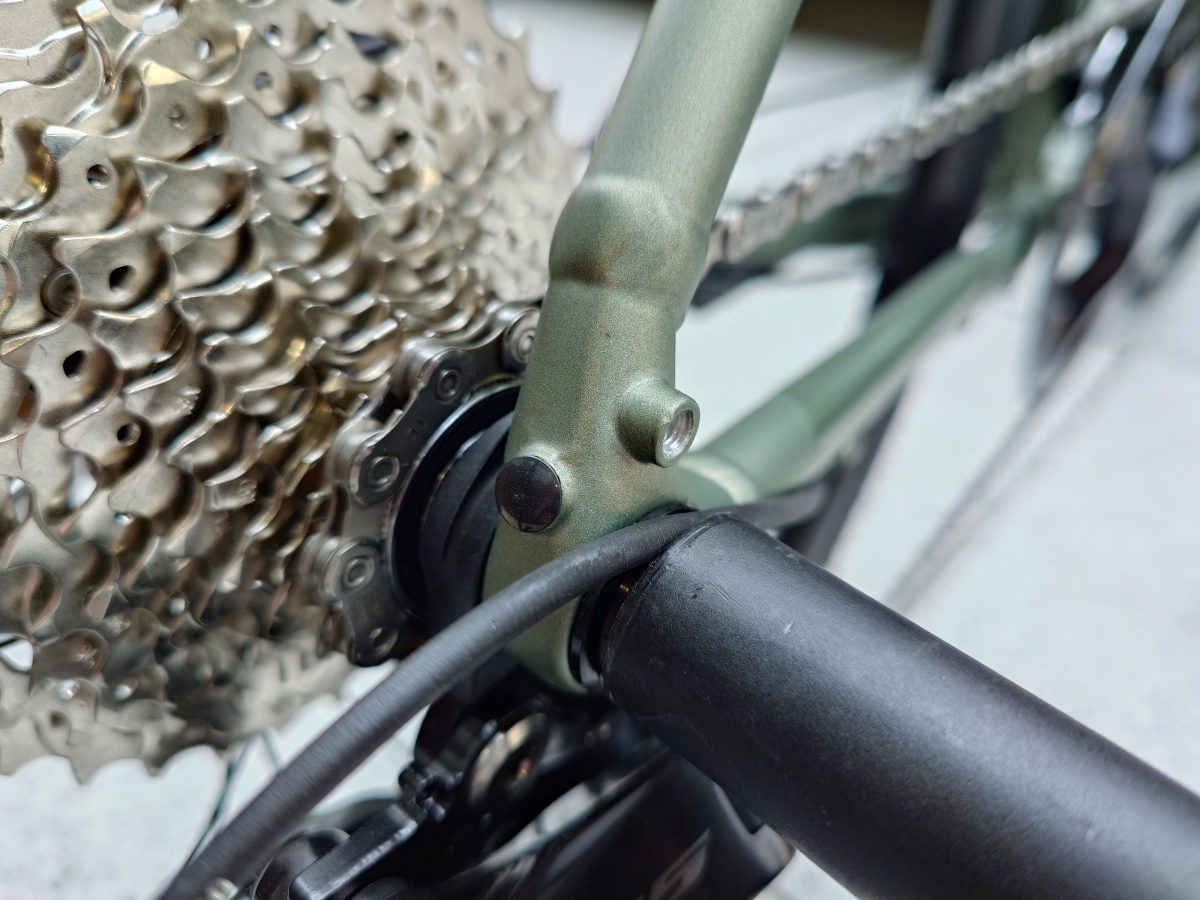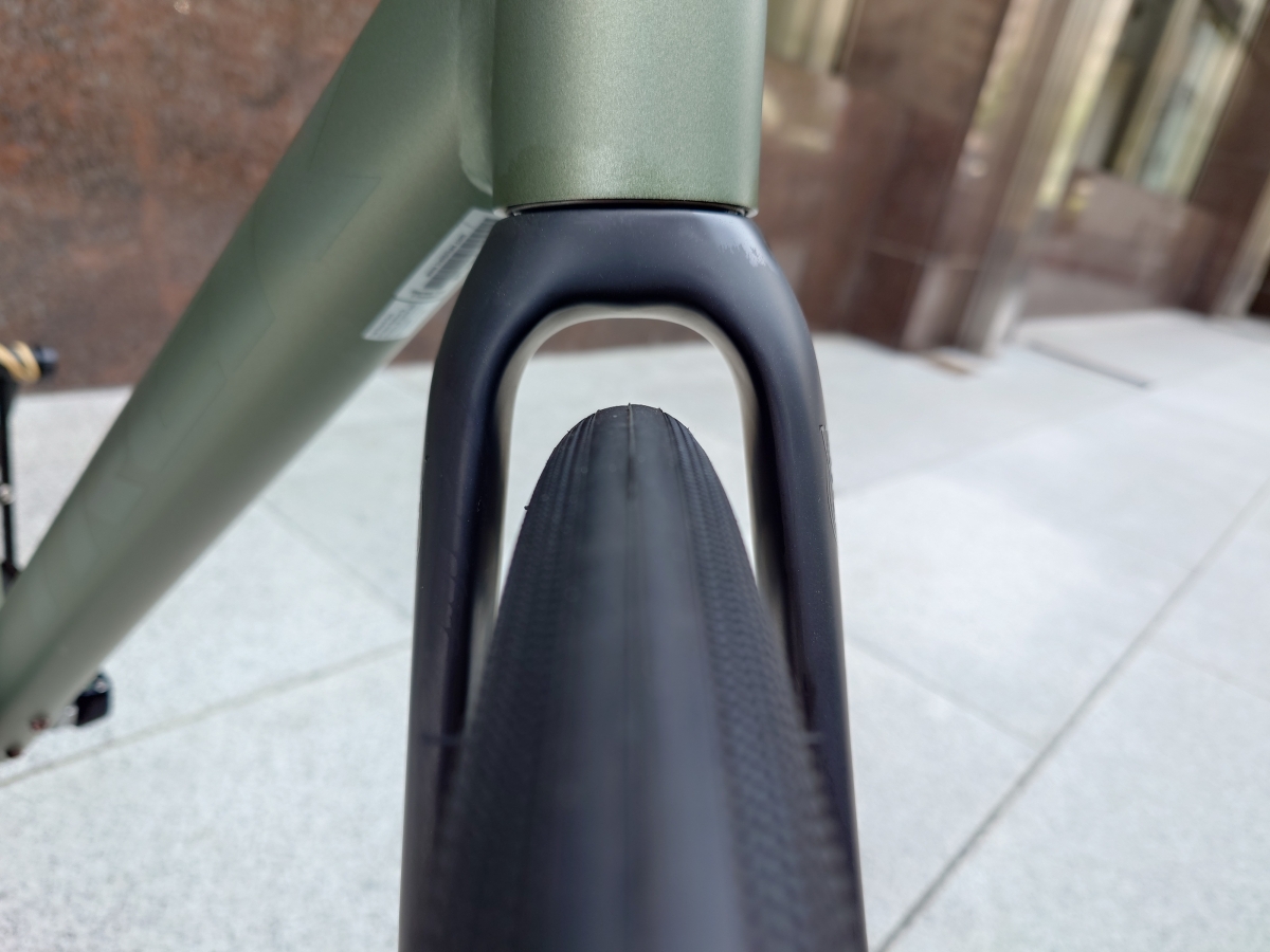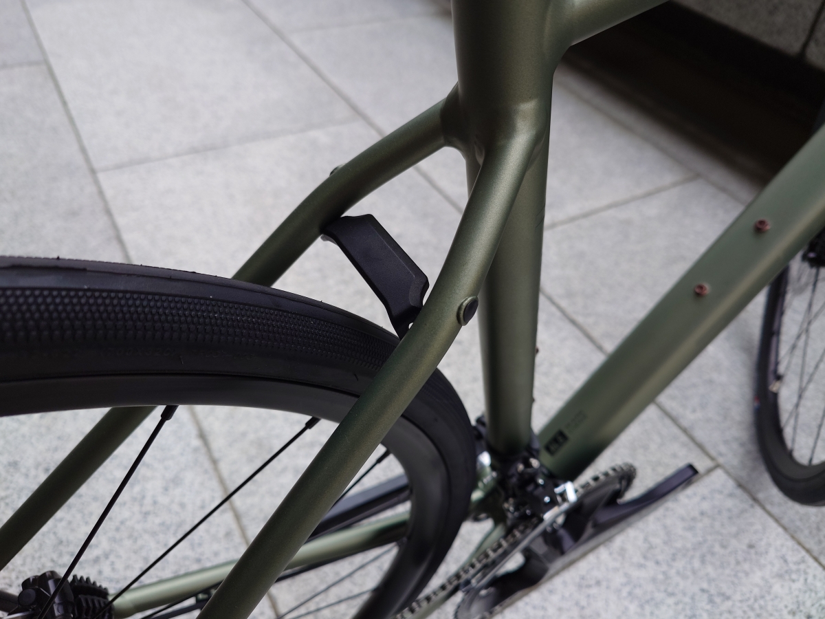 純正タイヤは32cで、21cの少し幅の広いホイールと相まって最初から結構太く見えたりますが、このフレーム実際は実測38mm程度までインストール可能。