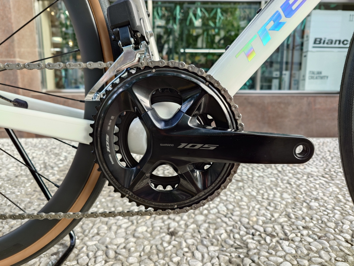 リム内幅は21mmで、割と標準的なスペック。戦略モデルと言われているSL5を105Di2に載せ替えて、カーボンホイールを入れて、ちょっと良いチューブレスタイヤにすると65万をオーバーしてしまうので、ちゃんと予算を割くと少しお得になるというイメージの車体です。