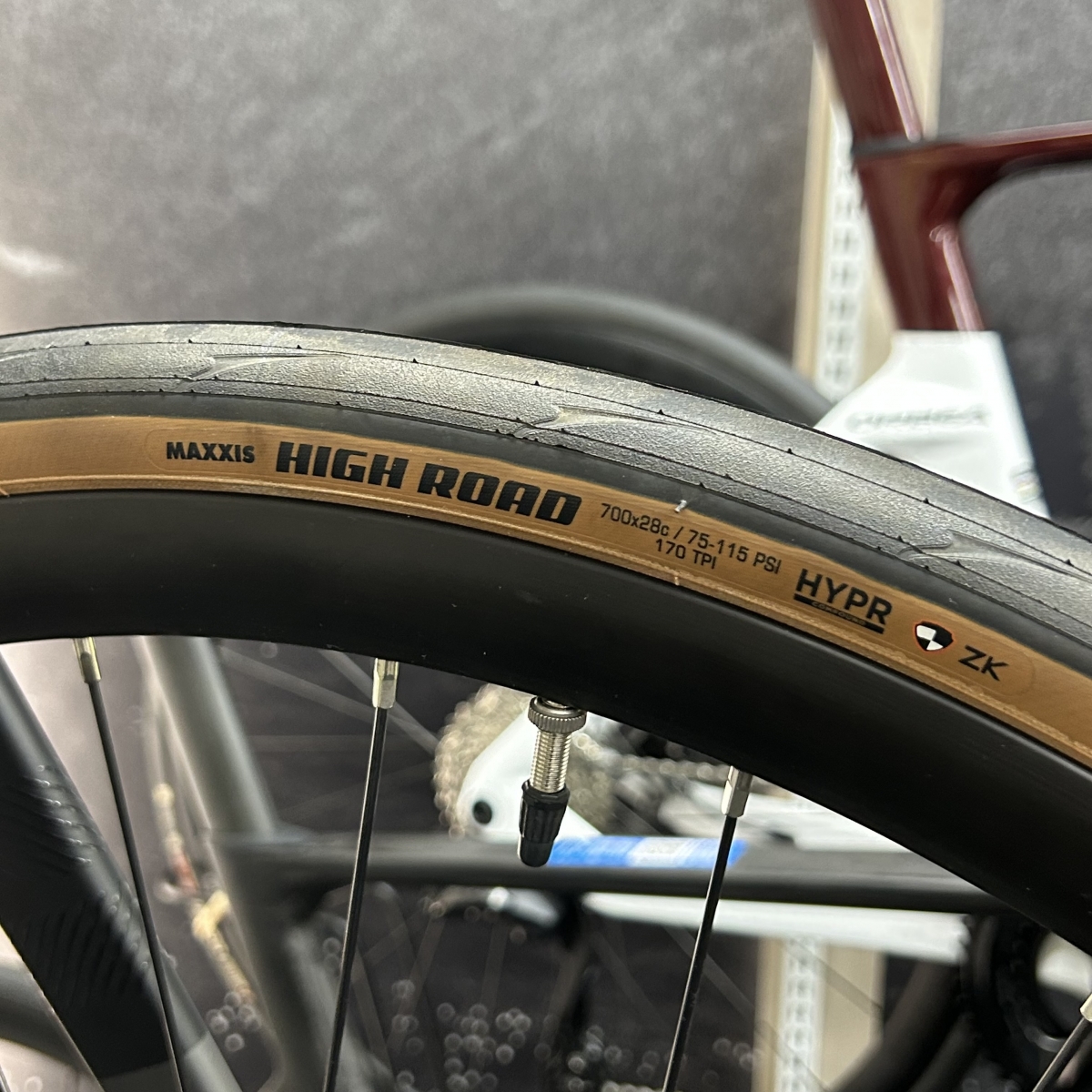 今回はMAXXIS HIGH ROADのタンウォールカラーにしてみました。1本10,560円(税込)とお高いタイヤですが、見た目も良くなって軽くなり、走行性能も上がるので一石二鳥なタイヤ選びだと思います。