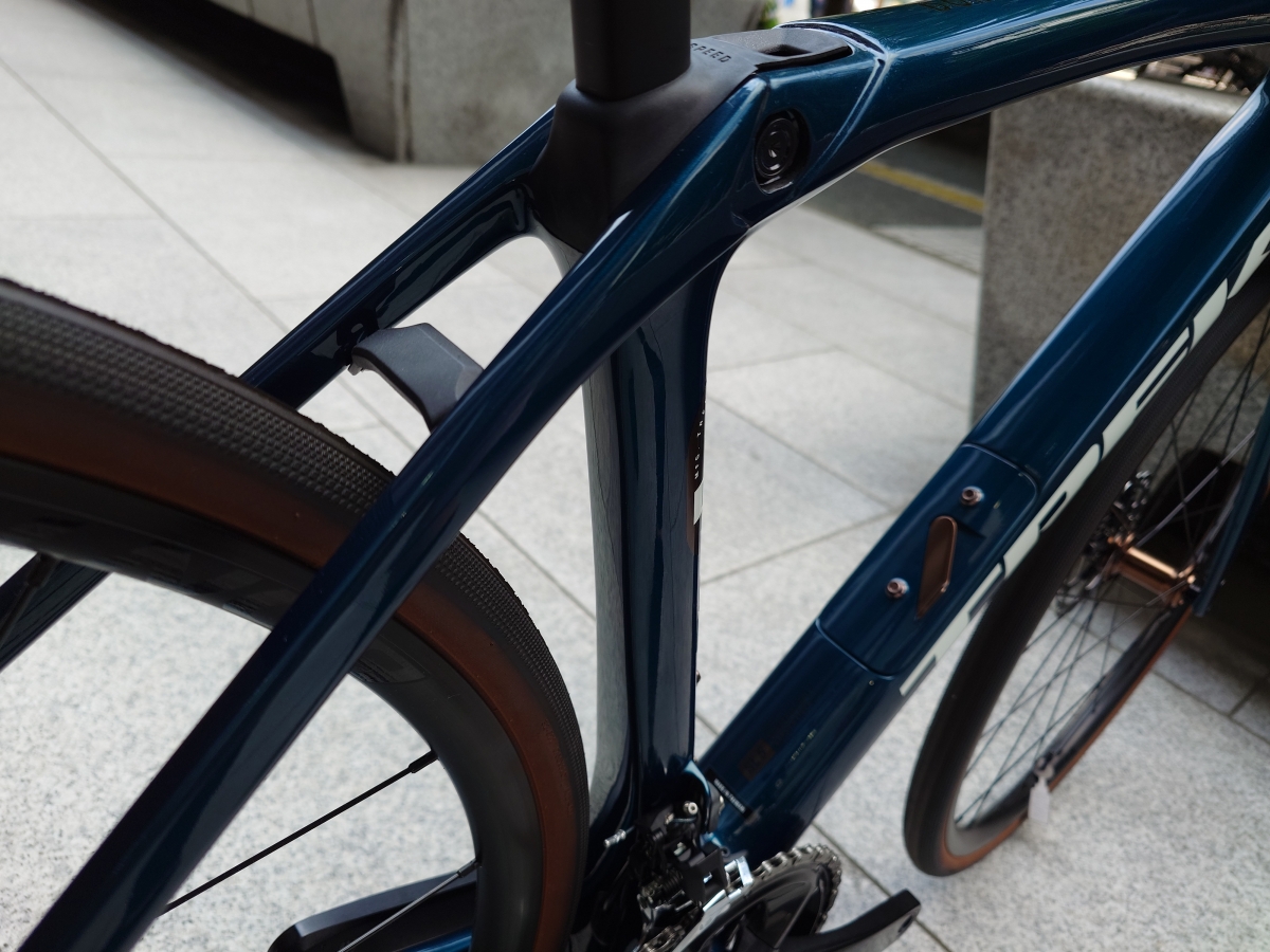 このDOMANE SLは実測38mmまで履くことができます。内幅25mmなどのハイボリュームホイールに32cでもいいですが、35cくらいのセミスリックタイヤをインストールしてグラベルライドもこなせちゃうワケです。