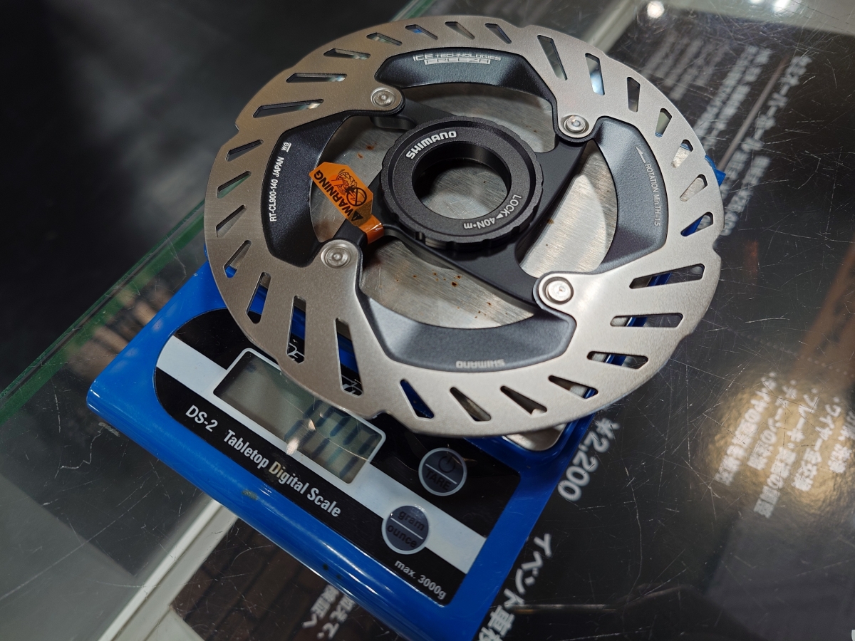 デュラエースのローターも、同条件ということでロックリングを乗せて計測。100gという結果に。カタログスペックは96gなので、大体4gくらいの重量がロックリングにあると予想します。