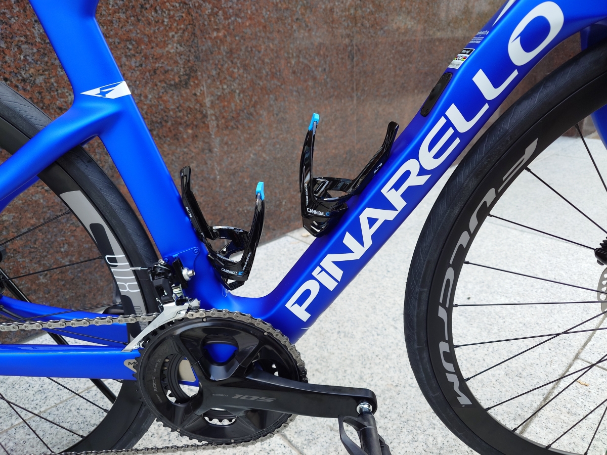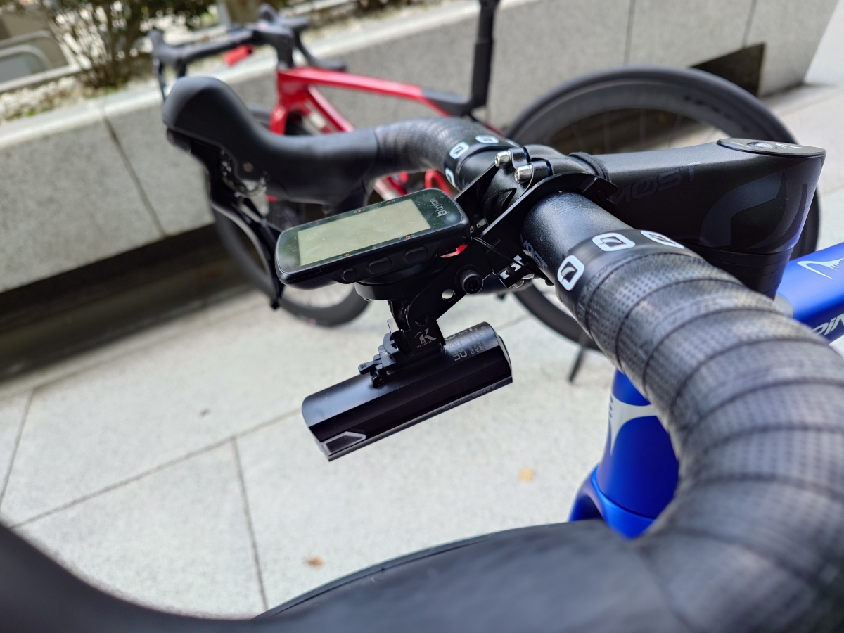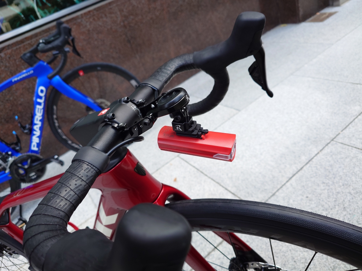 今期からホイールは51mmのディープリムになりました。グロスレッドとマットブラックのツートンボディに合わせて、ケージもグロスレッド/マットブラックの製品をチョイス。ライトも赤でキメています。