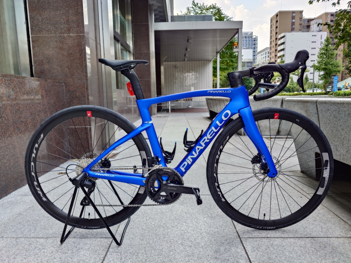 お父さんと対照的に、イタリアのレーシングメーカーPINARELLOをご指名。最高に渋いチョイスです、カラーも対照的にブルー。