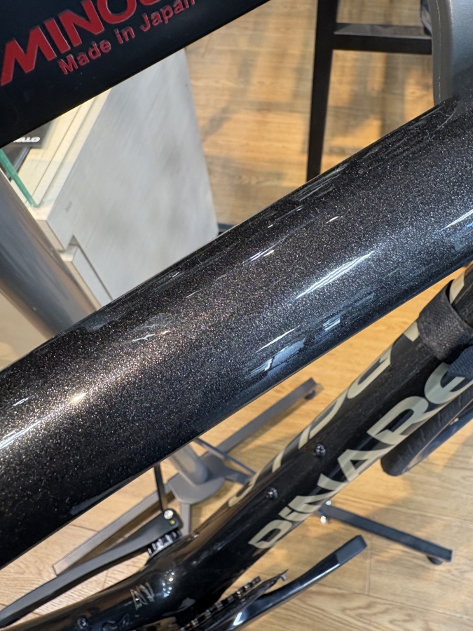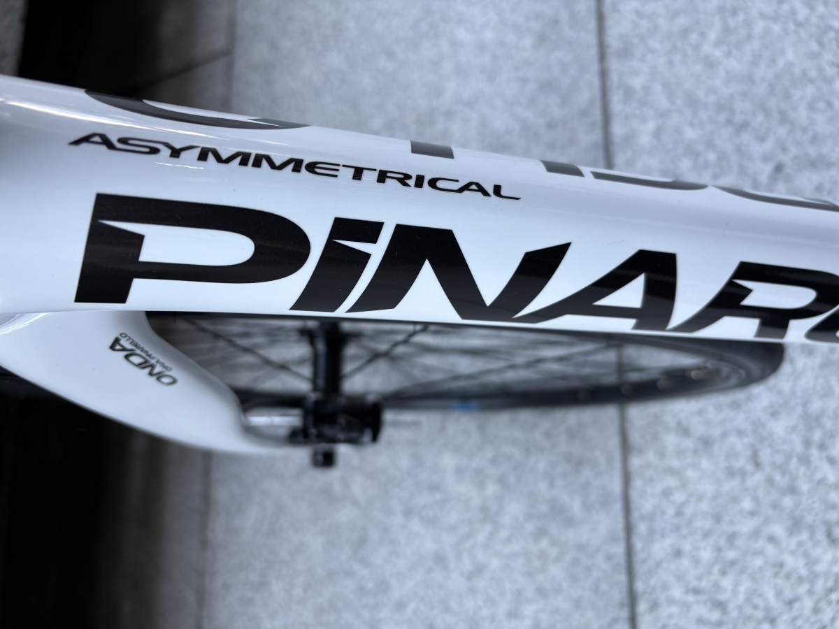 このバイク実は左右非対称なんですよね。チェーンを引っ張る力は右側にしかかからないからそれを偏らないようにバランスを取っているらしいです。このような特徴からPINARELLOのバイクは安定性が他のメーカーに比べると秀でています。このようなこだわりを持っているのは流石PINARELLOといったところでしょう。