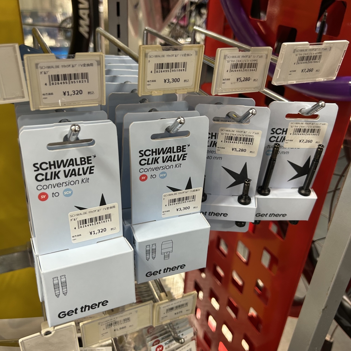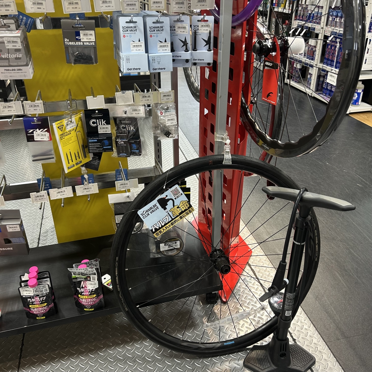 商品の近くにクリックバルブの付いたホイールと空気入れを置いてますので試してみてください!
