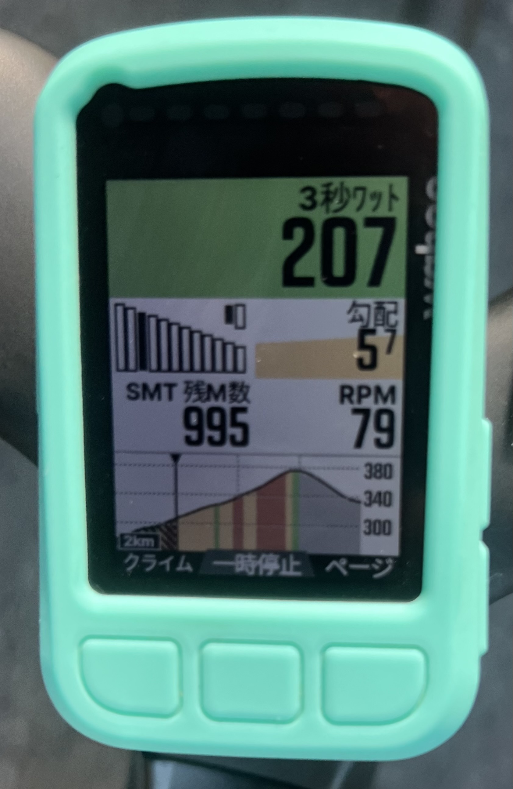 表示させているのは「3秒平均ワット、ギア比、勾配、残り登り距離、ケイデンス、登り断面図」