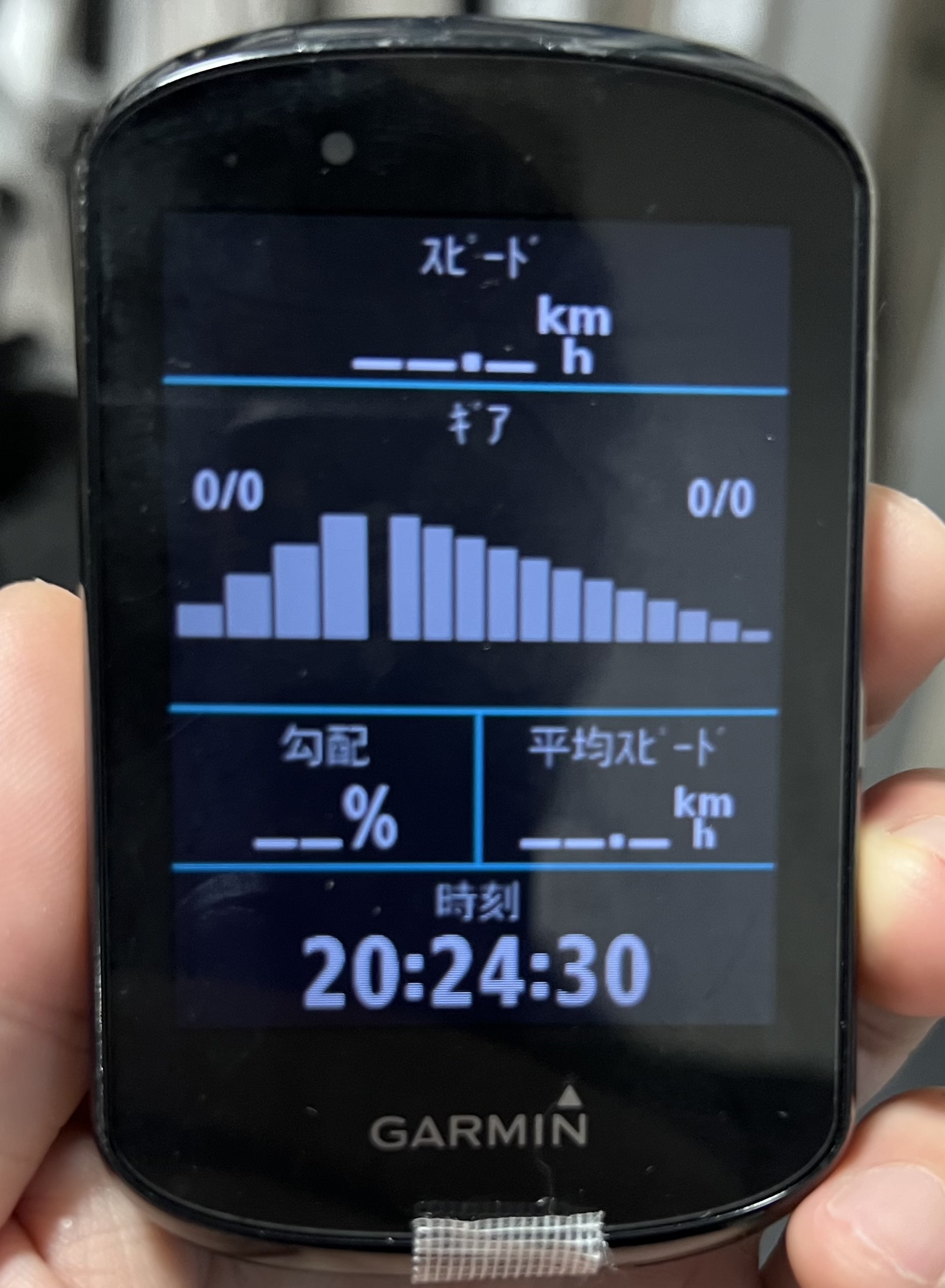 表示項目は全5つ「スピード、ギア比、勾配、平均スピード、時刻」