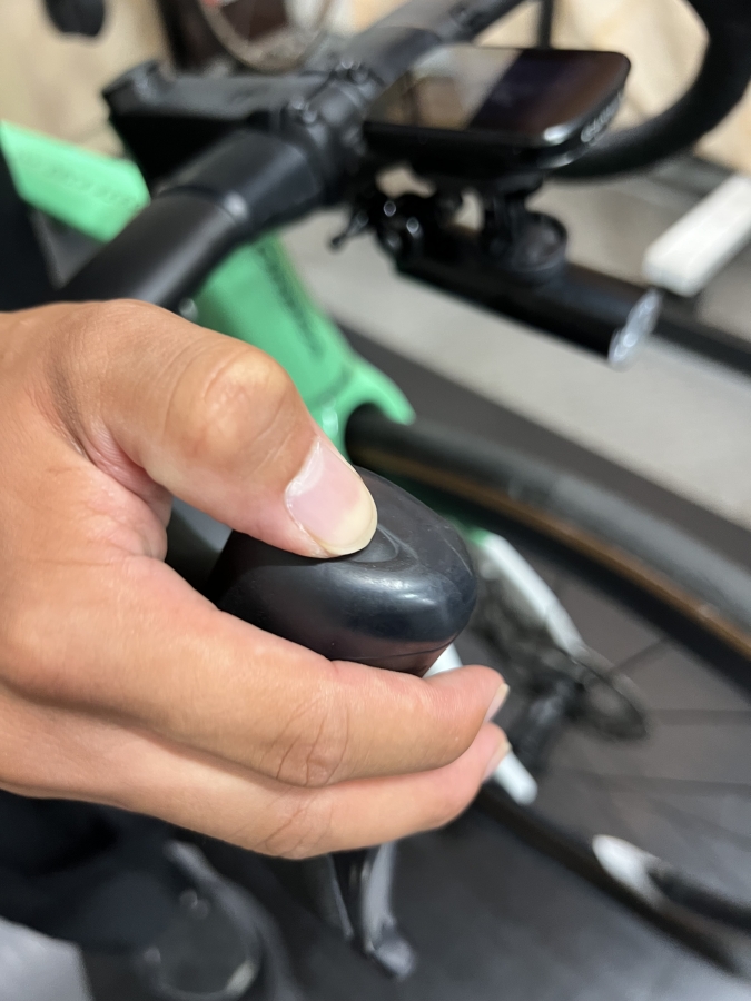 話しを聞いてみると「僕ULTEGRAのDi2使ってるんでSTIレバーの上ボタンでサイコン操作できる様にしているんですよ!これ拘っています!」との事。確かにハンドルから手を離さずに操作ができるのは安全面的にも有効的ですし、私もこの機能は正直羨ましいです。