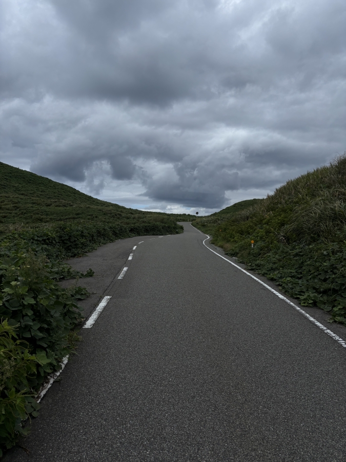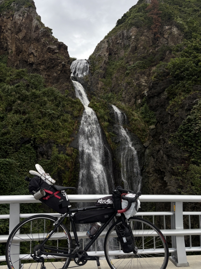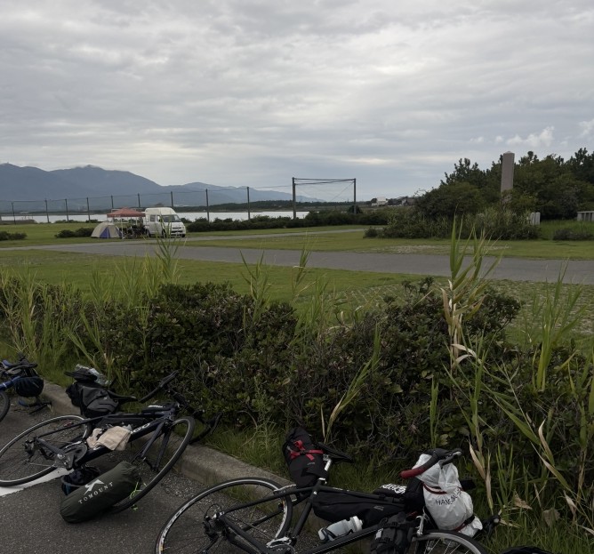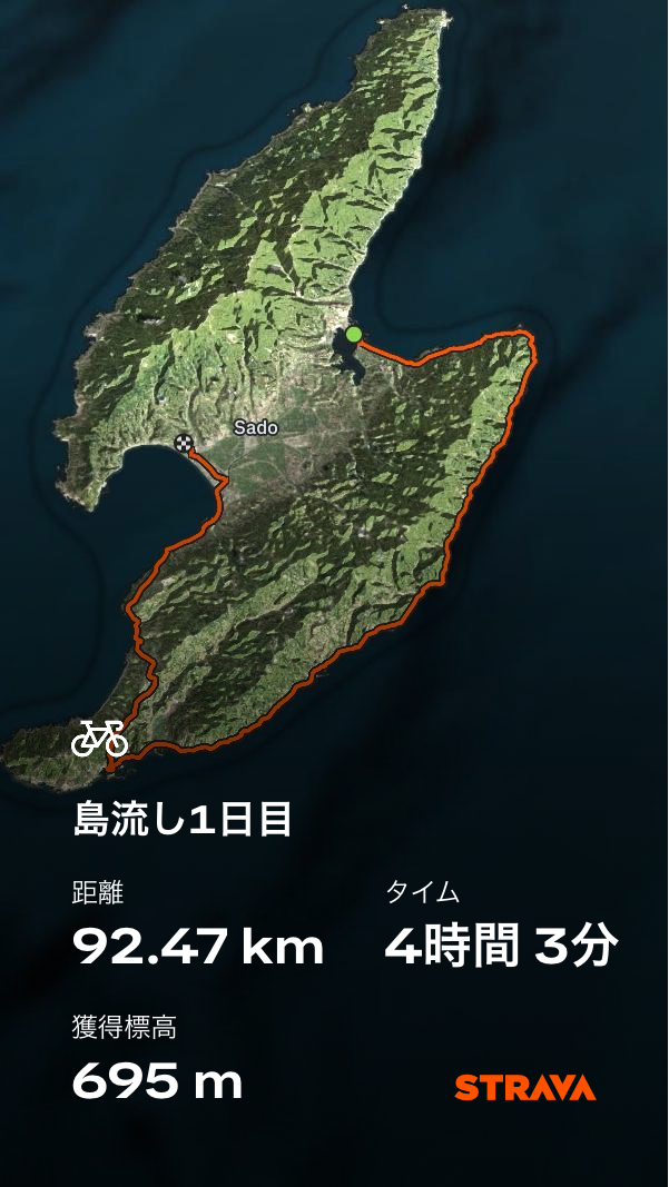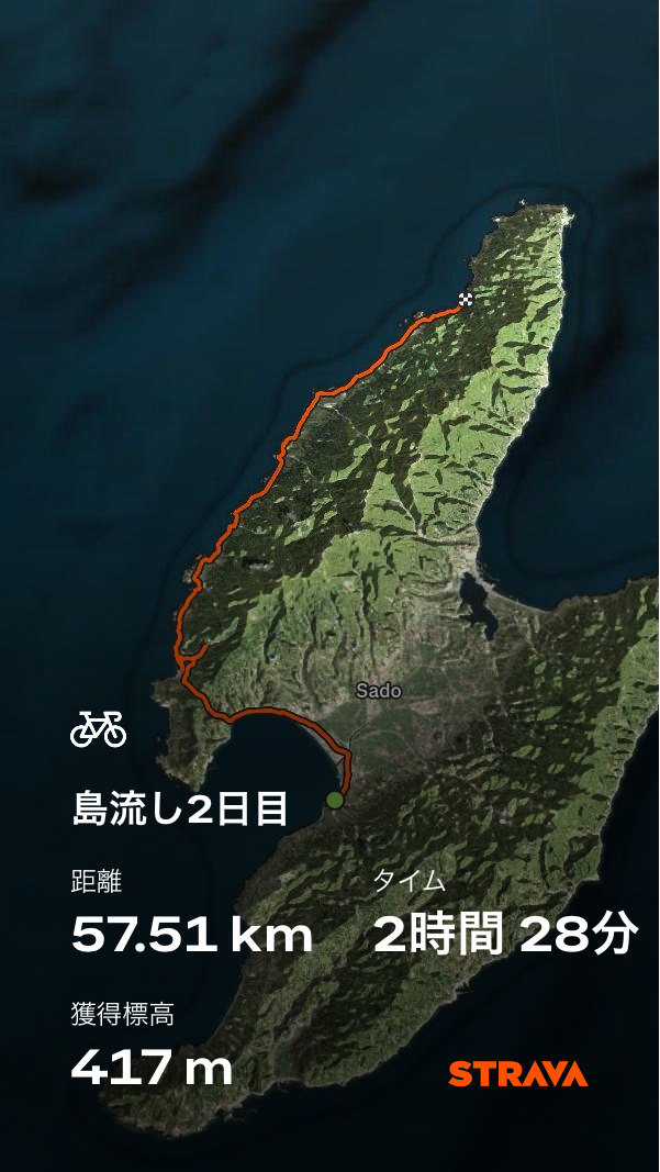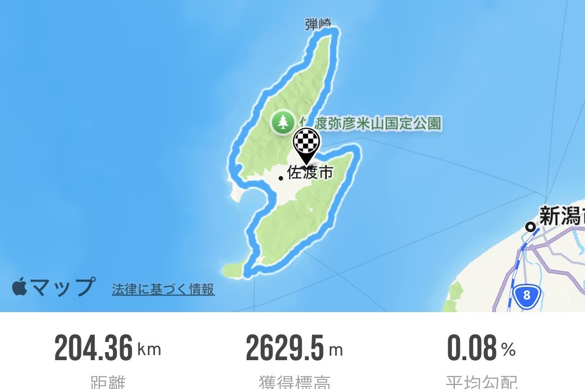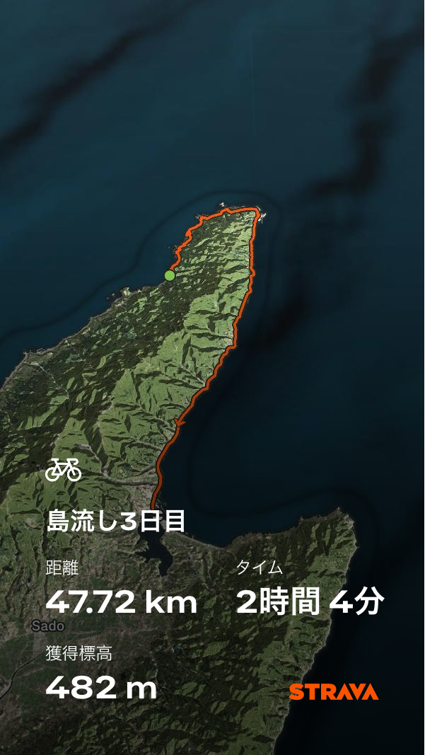 佐渡ヶ島は船で渡る必要があるのと、意外とアップダウンがあるのと、単純にキャンプ装備が重いので、余裕をもって一周できるようにするためです。