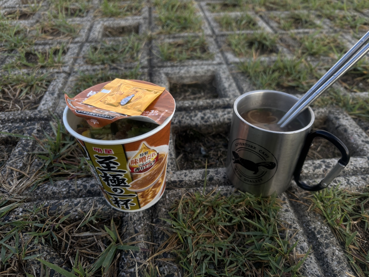 このカラビナ付きコップが良い味出してます。朝から味噌汁も良きです。