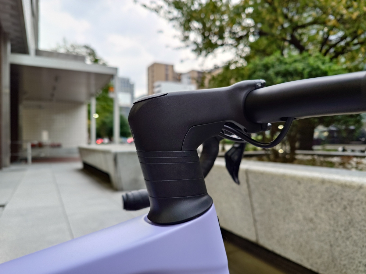 ハンドル高さは簡単に変えられる2分割式のスペーサー。ステムキャップは今は専用のエアロ形状ですが、丸型にも対応していて一時的に高さを変えてポジションを煮詰める作業も出来てしまうという、親切設計なのです。