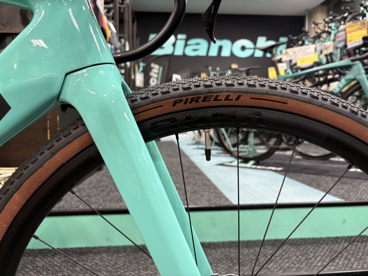 タイヤはPIRELLIのCINTURATO™ GRAVEL H 700×40Cを装備一本あたり12,800円の高級タイヤとなっており、オンロードでの極上の乗り心地はもちろん、オフロードでも力強い走りの魅せます。飴色サイドがチェレステカラーとマッチしてオシャレとなっています。