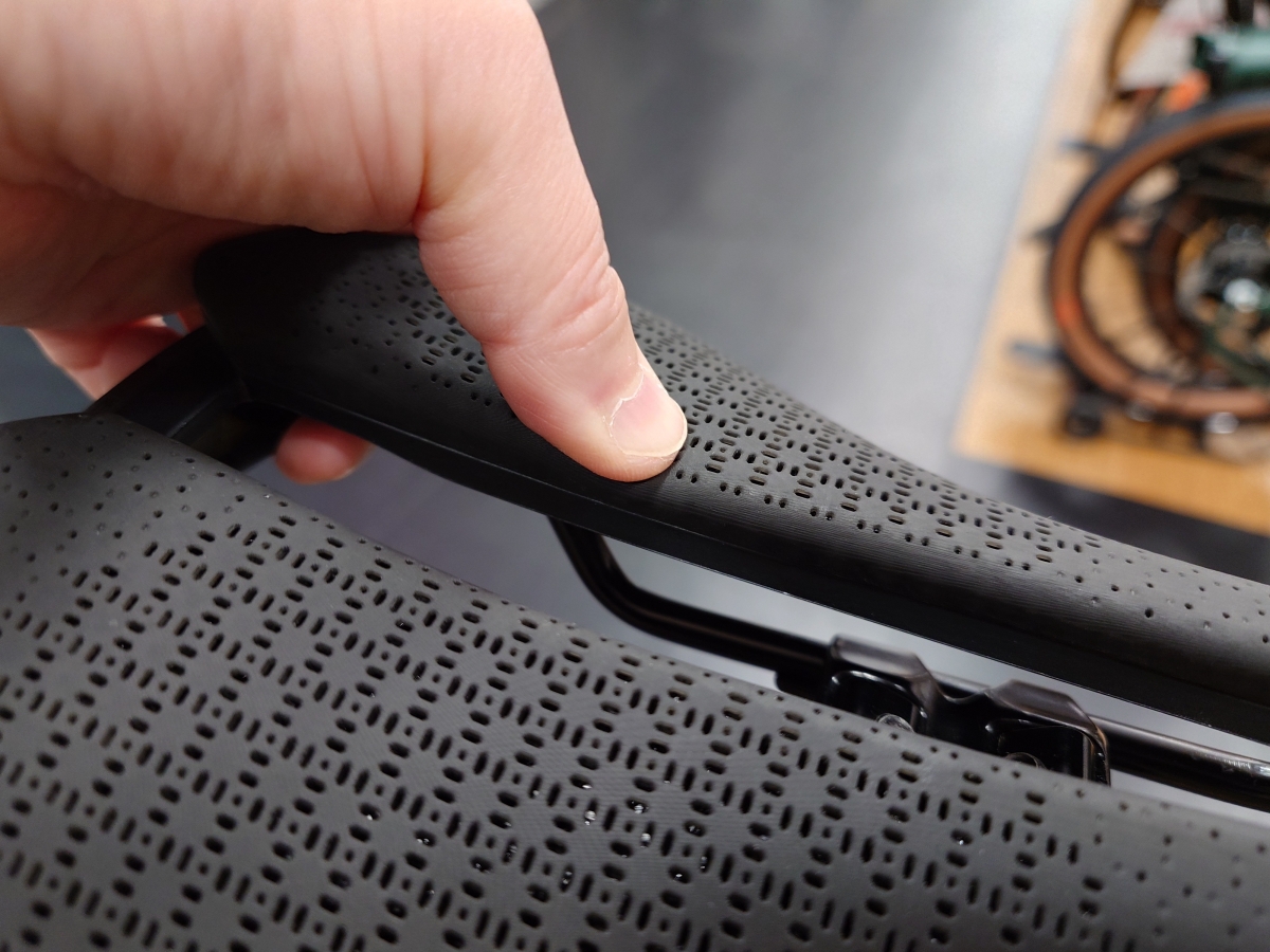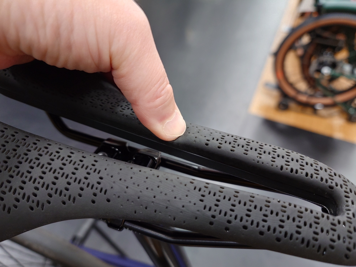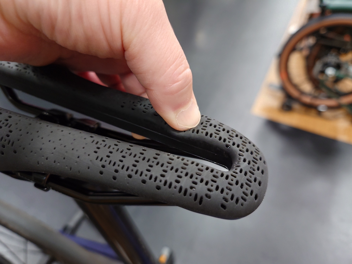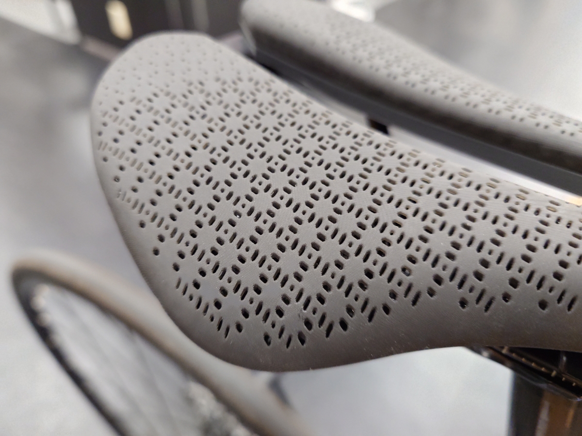 このモデルでは表皮とあんこが一体化しているというのが特徴。ペダリングなどで脚や座骨が前後左右に動くのですが、その動きに座面全体のラティス構造(八面体の格子)が追従することで、摩擦を生まずに痛みの出にくい理想的な状態を保ってくれます。