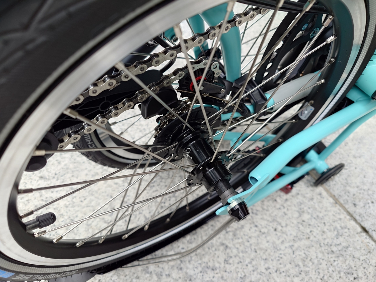 ご覧の通り、外装2速モデルと同じシュッとした細いハブ。これが軽量でいいんですよね~。内装ハブモデルは後輪だけずしッと重くて、前後のバランスがちょっと悪く感じてしまうのですが・・・。そういうのは無いワケですよ。