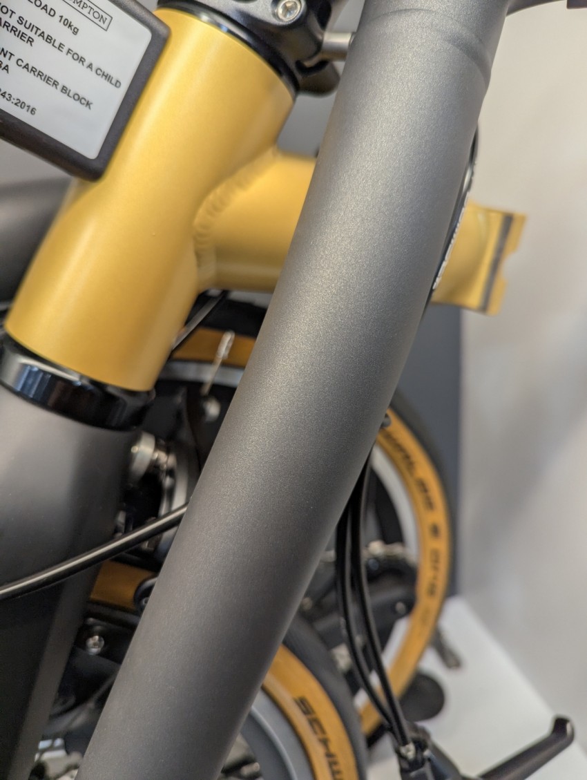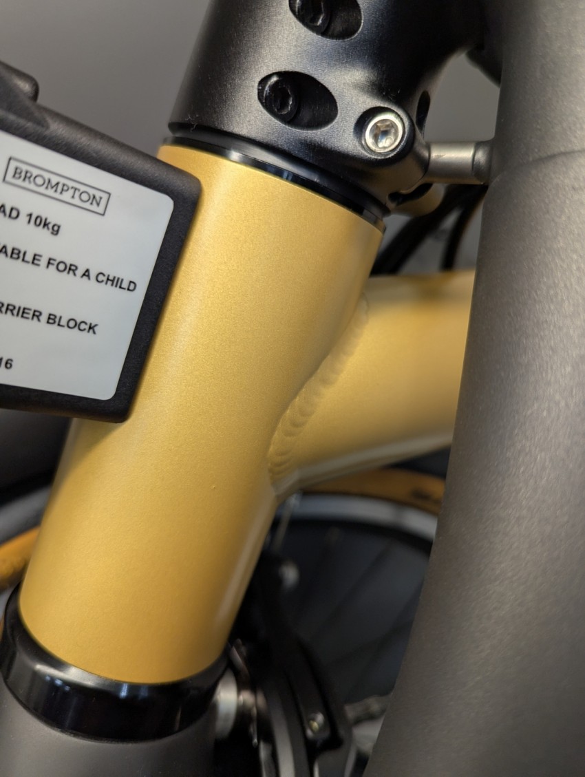 ブロプトンは折り畳み自転車なので、メインフレームとリアフレームが分かれており、C LINEではフレーム全体がスチールで作られています。