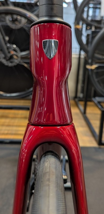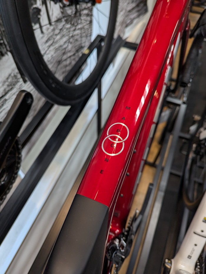フレームのルビーレッドの色にシルバーのロゴがとてもマッチしています!