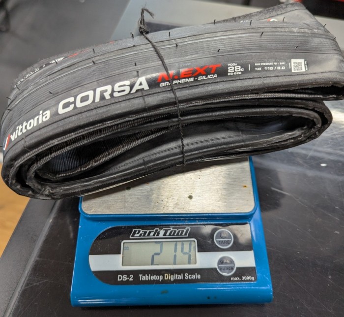 続いてタイヤが純正のZAFFIRO PROが340gで、今回選んだCORSA NEXTが214gとなります。
