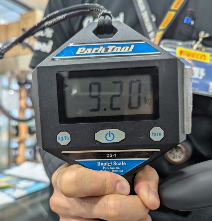ペダル無しボトルケージなしの状態で実測重量が9.2kgとなりました。