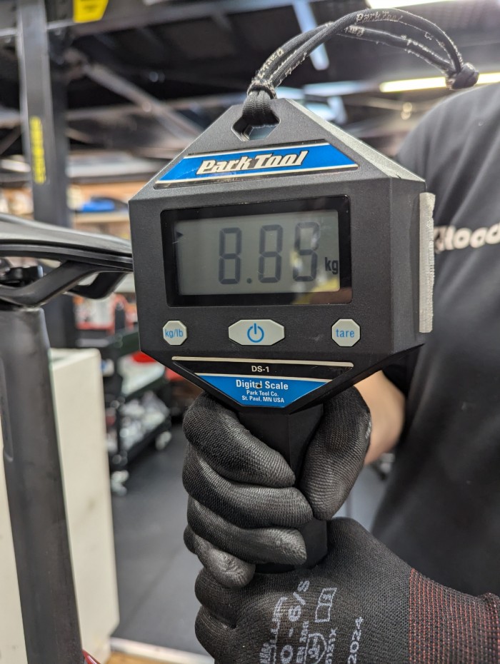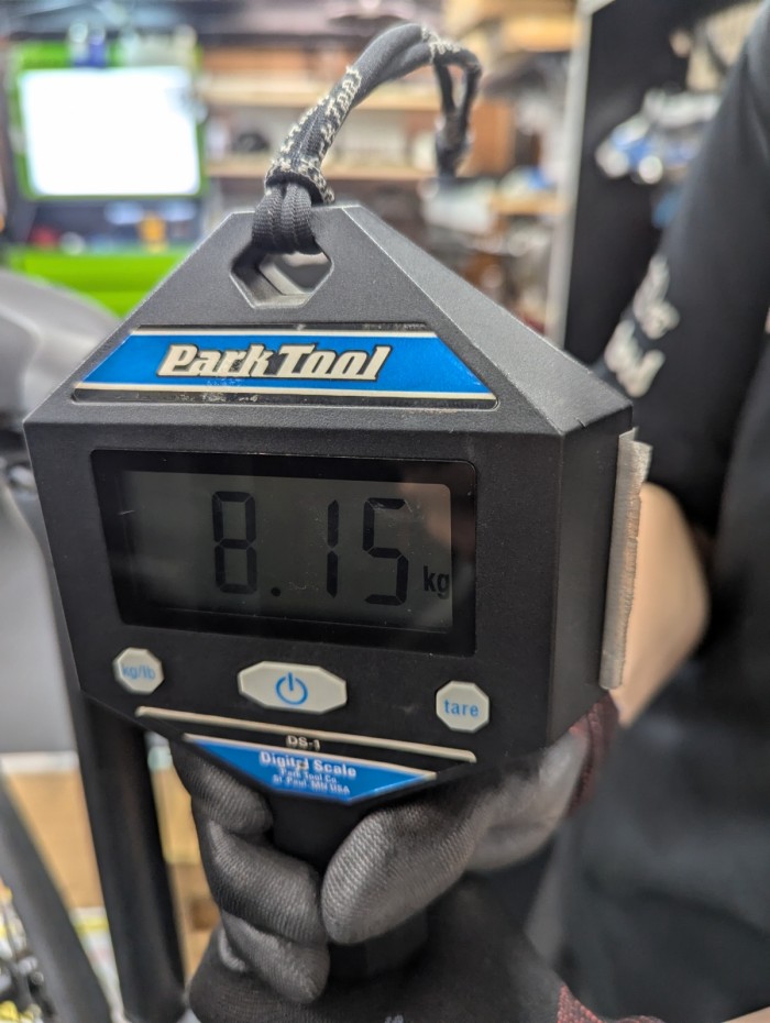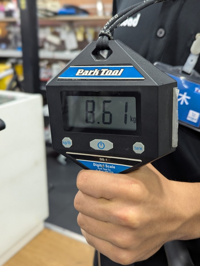 当店にはたくさんの車体があるのですが、ふと店頭価格40万円前後のミドルグレード完成車の重量って何キロくらいなんだろう?と気になったので、測ってみました!