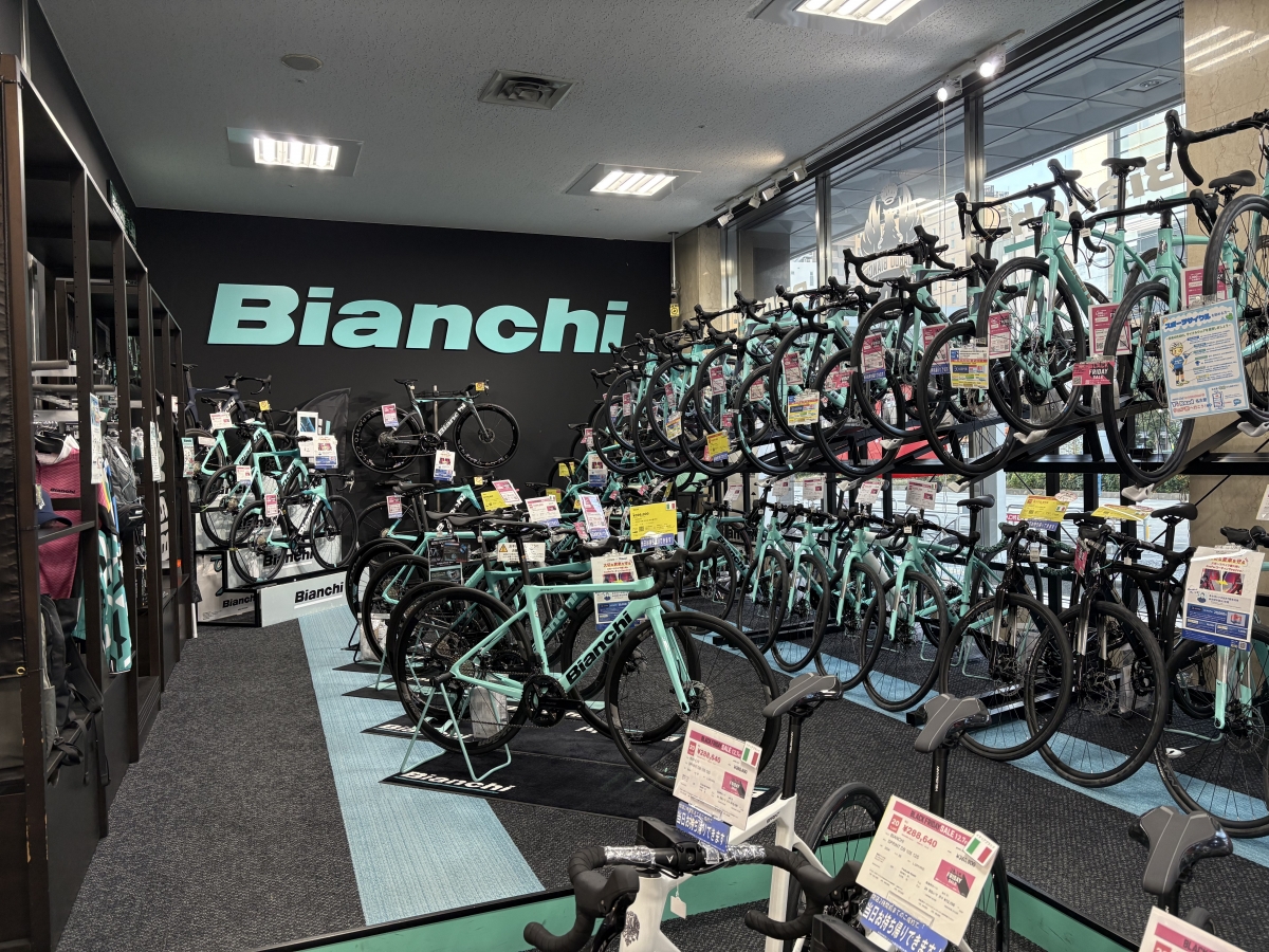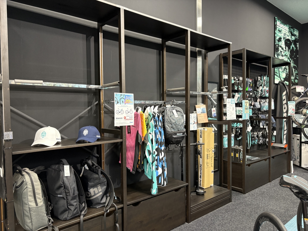 バイクに限らず様々なBIANCHI商品があり、チェレステカラーを存分に味わえるコーナーとなっております。BIANCHIファンの方は是非お越しください。